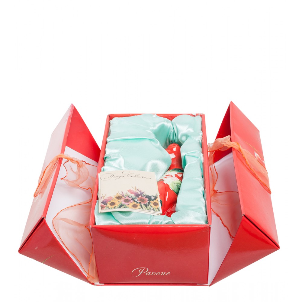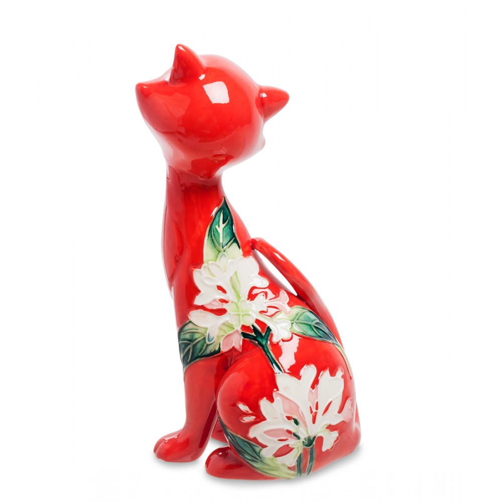 Интересная фарфоровая кошка, во внешности которой есть нечто африканское. Блестящая глазурь делает дружелюбное существо ещё более заметным. Ярко-красный фарфор выигрышно смотрится и при дневном, и при искусственном свете. Цветок с листьями, украшающий тело домашнего питомца, хорошо подходит к стройной фигурке.