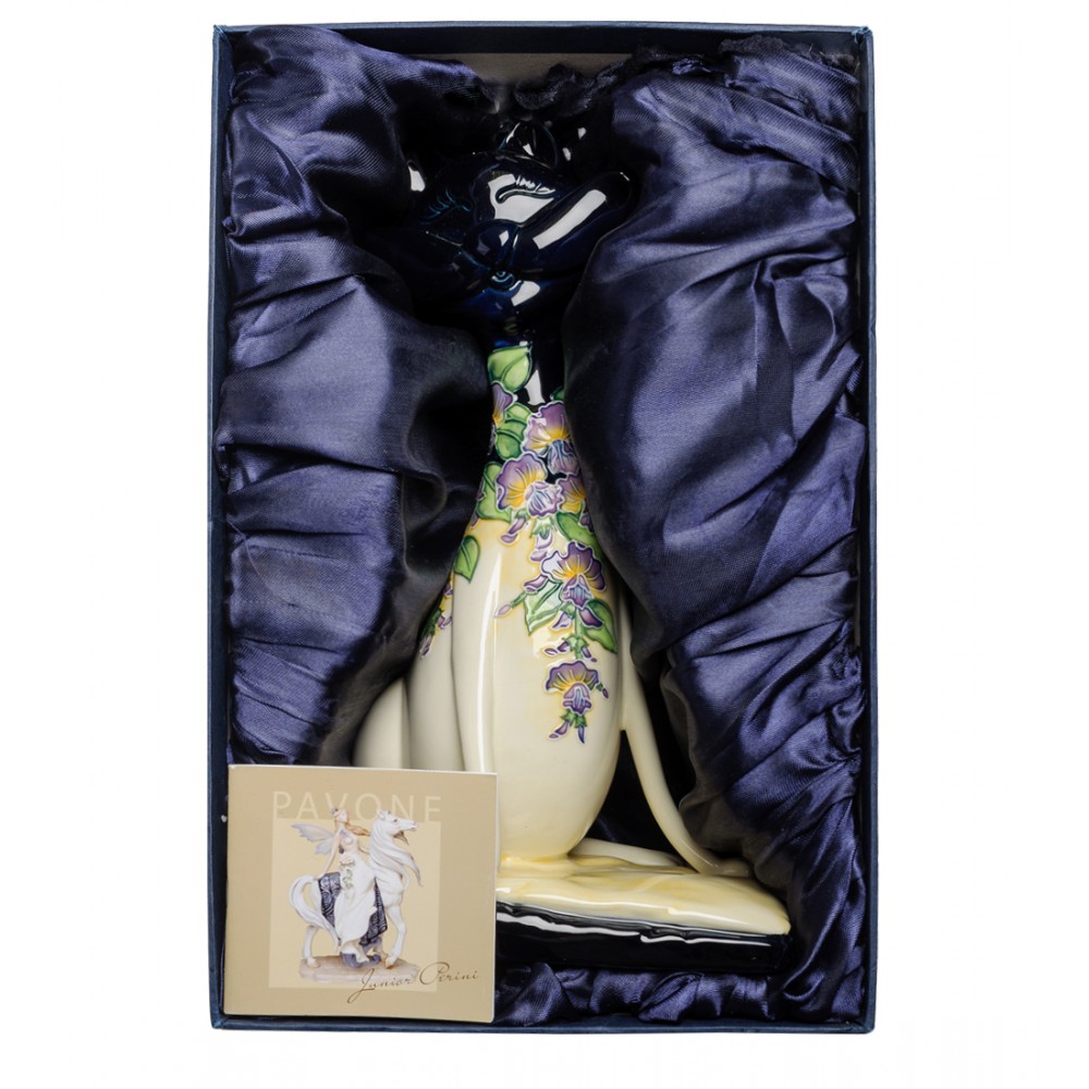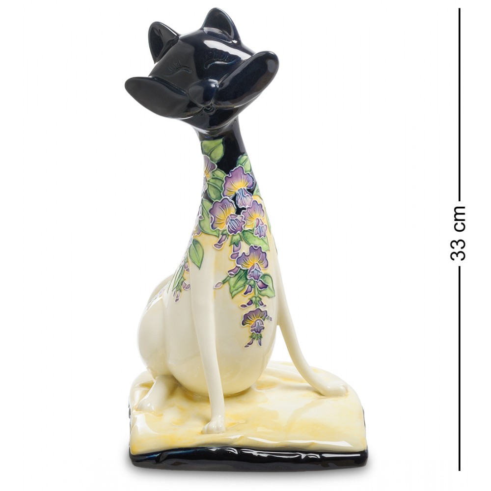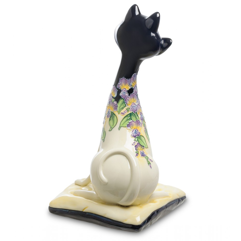 Фигурка улыбающегося кота поражает и привлекает своей игривостью и хорошей энергетикой, которая от нее исходит. Черная мордочка превосходно контрастирует со светлой нижней частью. Тонкие лапки завлекают своей изысканностью и грациозность. А нежнейшие мелкие цветы, лепестки которых проработаны до самых тонких мазков, придают фигурке утонченности и изящности.