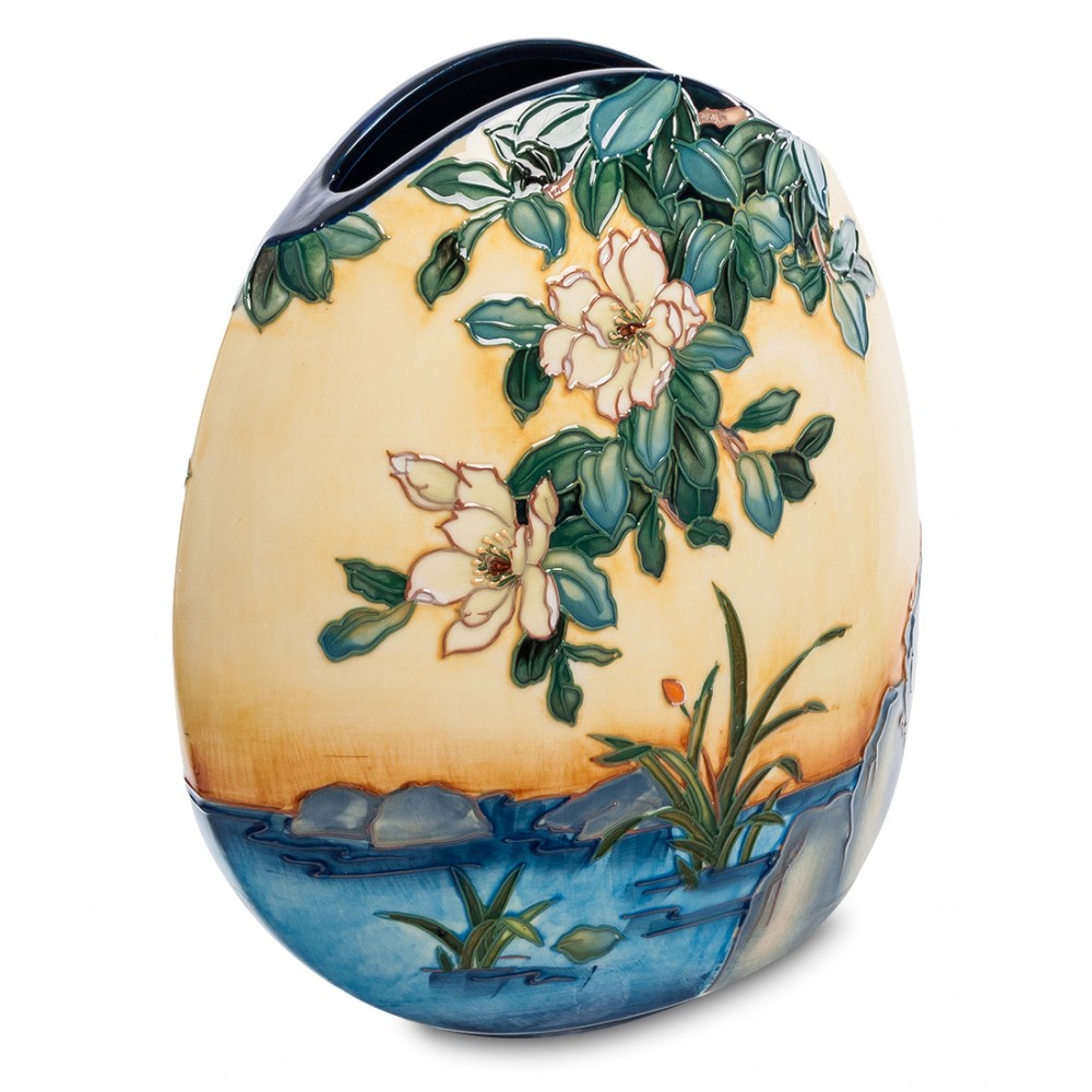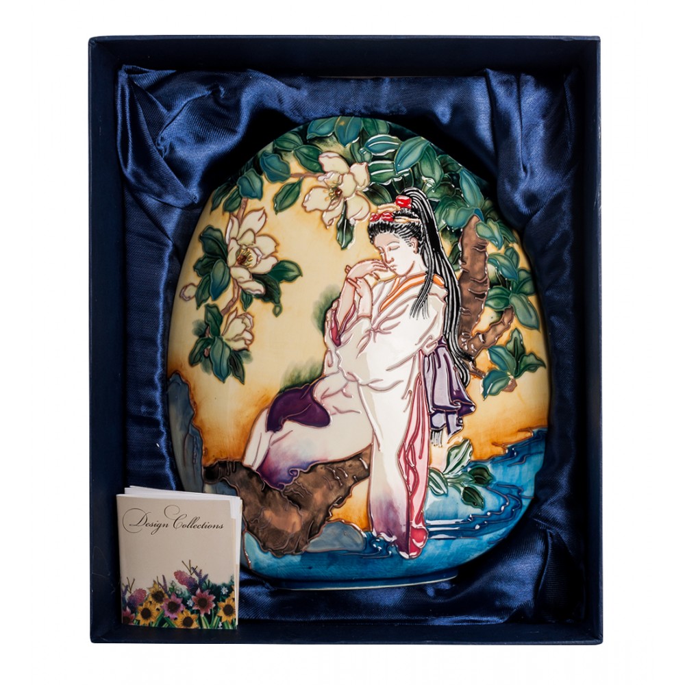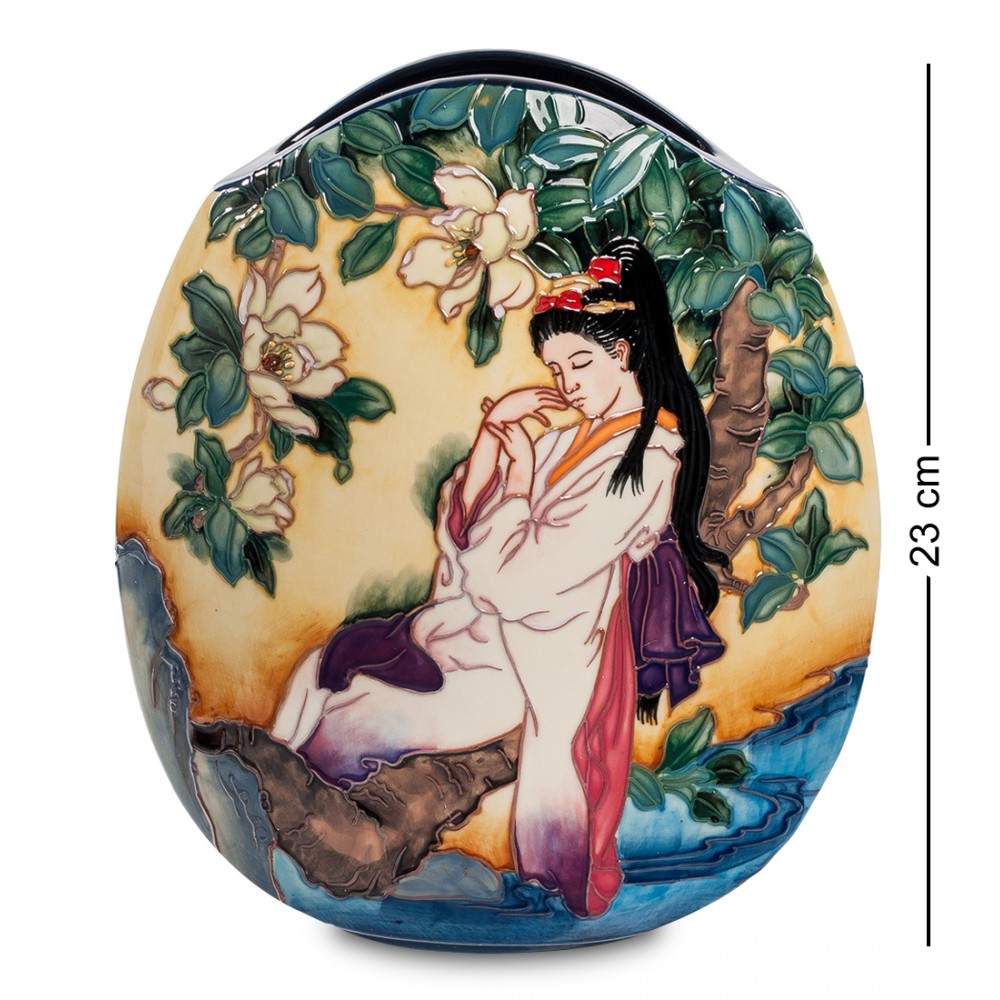 Фарфоровая ваза « Гейша » имеет оригинальную яйцевидную форму. Этот аксессуар имеет художественное оформление в японском стиле. На лицевой стороне вазы мы видим задумчивую девушку в свободно спадающем кимоно. Она сидит на ветви старой магнолии, которая как раз находится в фазе цветения. Помимо больших белых цветов магнолии наше внимание привлекает спокойное синее море, которое находится на заднем плане. На обратной стороне вазы изображены цветы и вода.