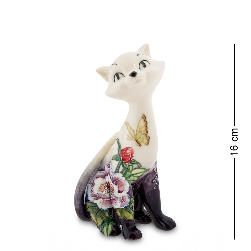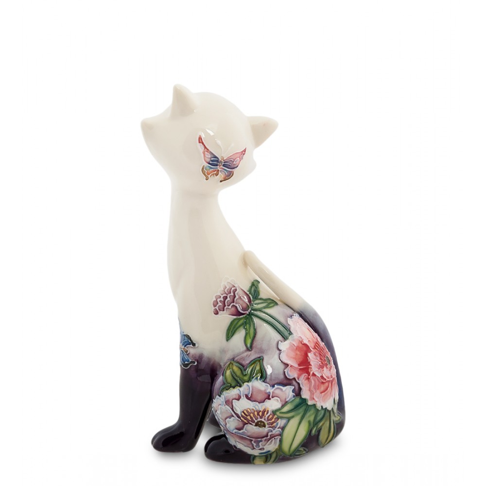 Изящная кошечка сидит среди пышной садовой растительности, распустившихся разноцветных цветов и внимательно смотрит на летающих вокруг бабочек. Все эти цветы и бабочки на самом деле не соседствуют с фигуркой кошки, а нарисованы на ней, но получается вполне реалистично. Прямо кусочек природы, летнего дня, перенесенный на стол в вашей комнате и не тускнеющий при любой погоде.