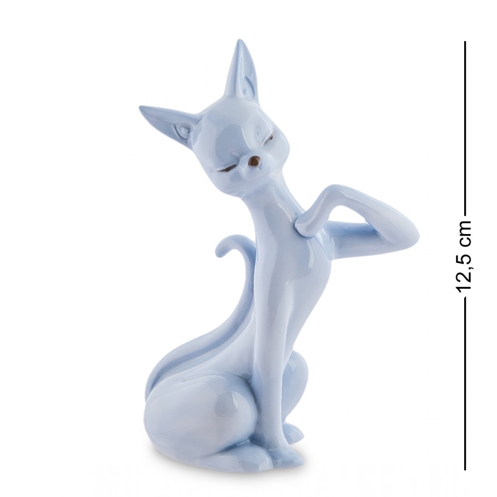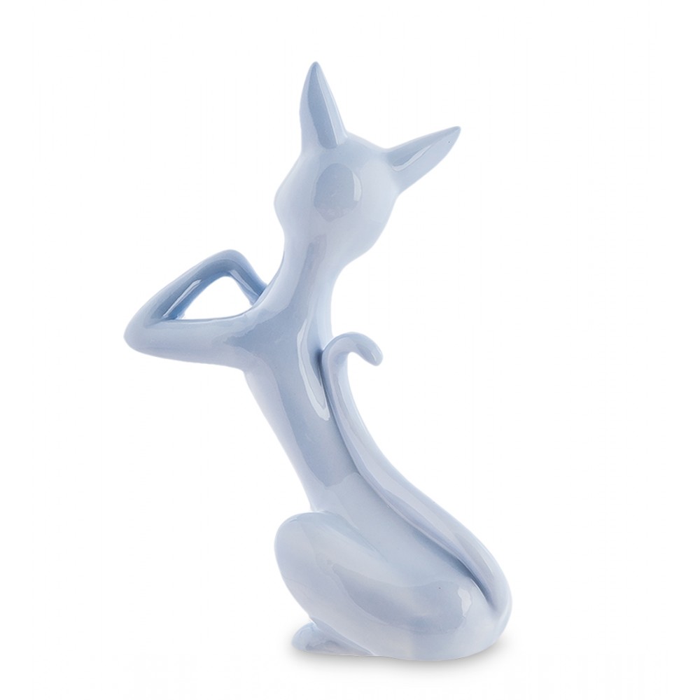 Изящная статуэтка « Кошка » светло-голубого оттенка выглядит необычно. Её грациозная фигура и симпатичная мордочка идеально ей подходят. Несмотря на отсутствие декоративных элементов, богатой росписи и различных оригинальных украшений, она выглядит мило и забавно. А её особенный жест лапкой, может означать, что ей хочется побыть одной.