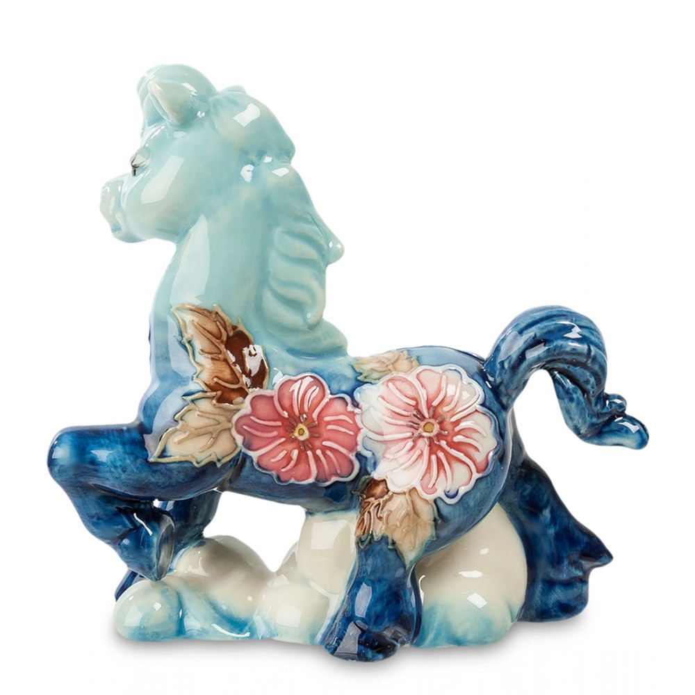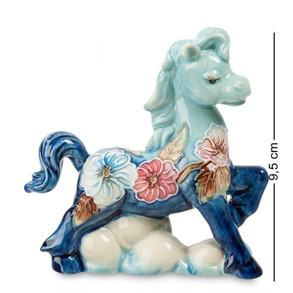 У фарфоровой лошади пышный синий хвост и не менее пышная грива, напоминающая красивую женскую прическу. Веки и ресницы лошадки художники украсили тонкими черными линиями, чем окончательно приблизили лошадь к человеку. Лошадка расположилась на небольшом голубом облаке с приподнятым левым копытом и застыла: в этой позе она напоминает фотомодель, позирующую перед фотографом.