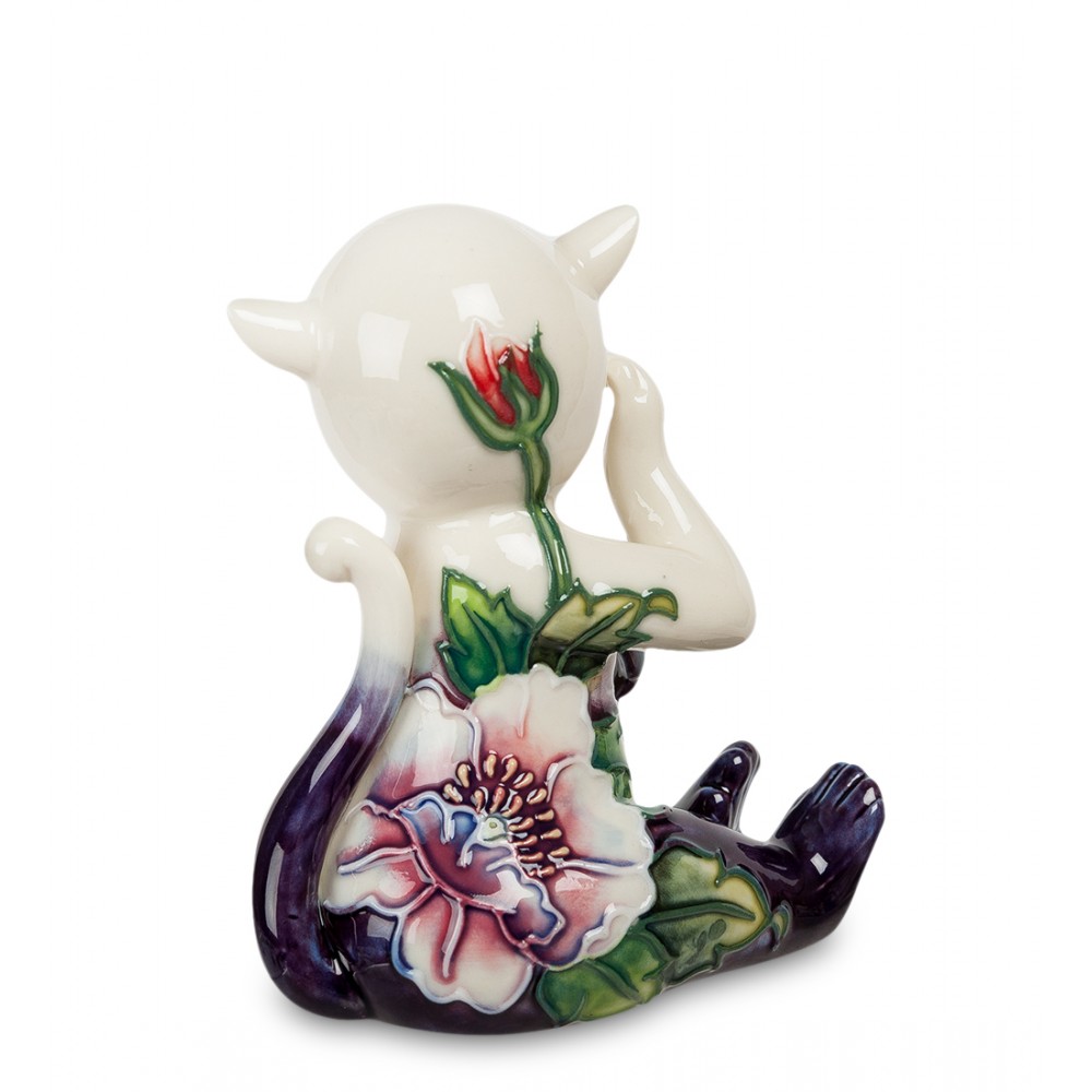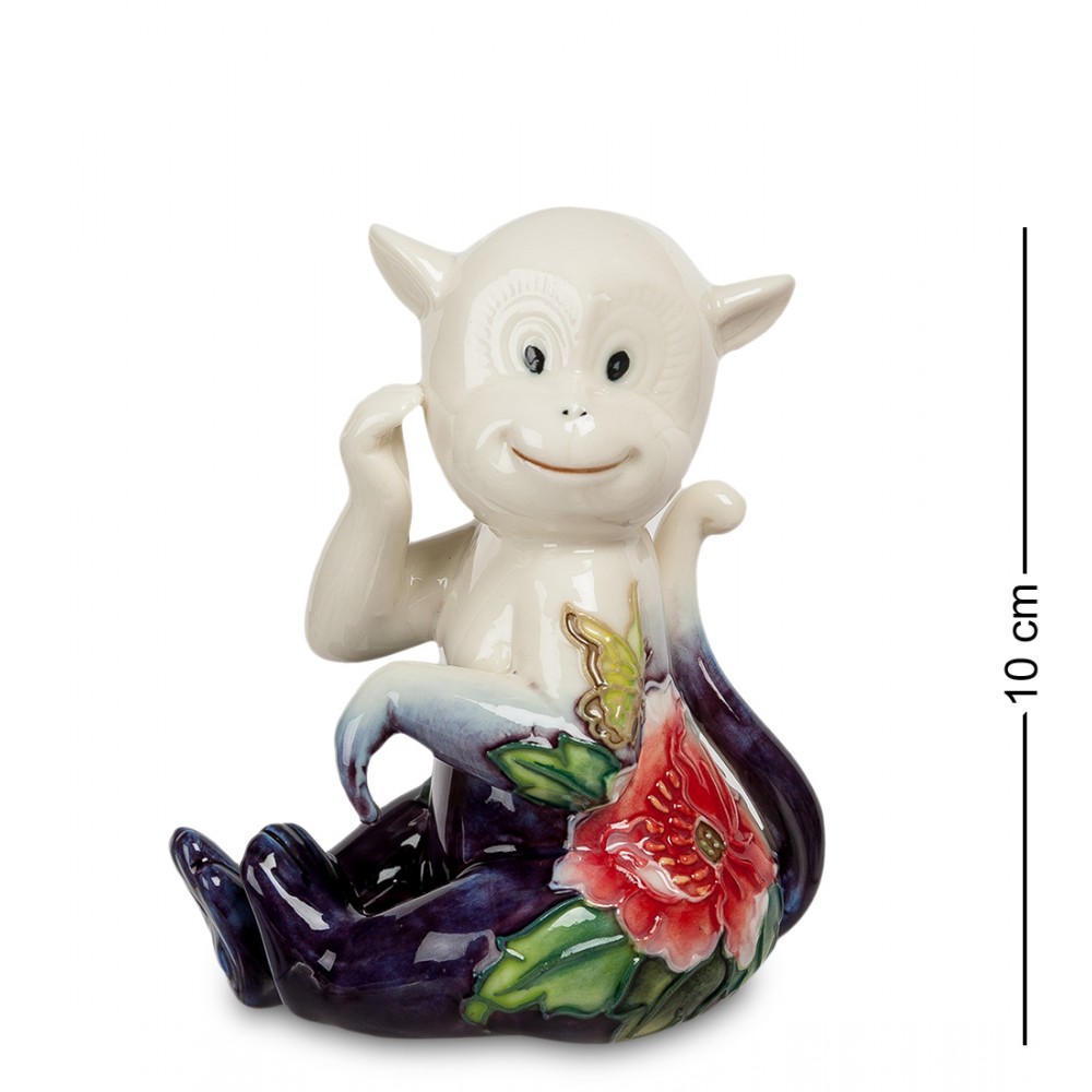 При взгляде на эту милую фигурку обезьянки, вырисовываются только добрые слова: « Какая красота! » И в самом деле, мастера потрудились создать оригинальный силуэт, в котором совмещаются темно-синяя и белая палитра цветов. Она осыпана шикарными большими цветами, которые украшают её. Обезьянка задумчиво смотрит и улыбается, как будто её отвлекли от какого-то дела.