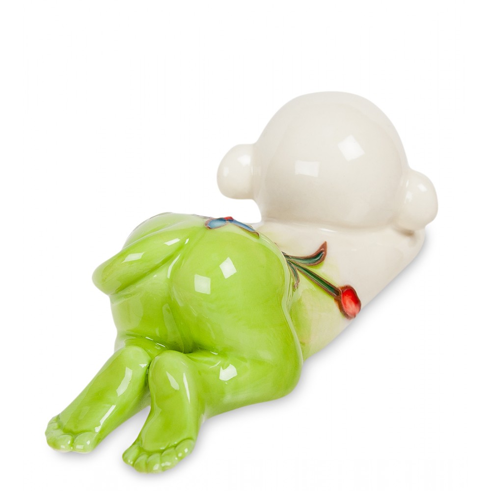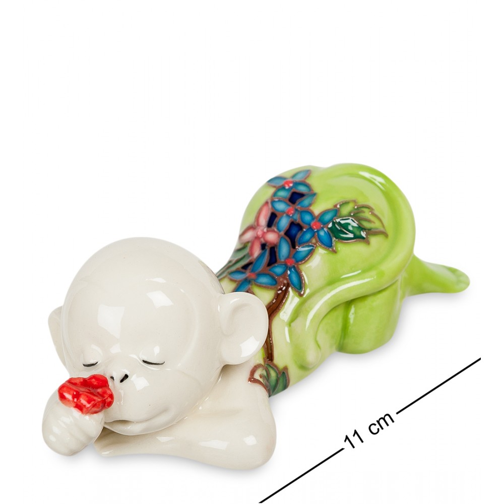 Фарфоровая фигурка обезьянки необычно красива, благодаря сочетанию зеленого и белого цвета. Нежность цветовой гаммы передает общий образ. Обезьянка словно задумалась о чем-то, мило лежит с закрытыми глазами, словно загорает на солнышке, и можно увидеть ее едва заметную улыбку.