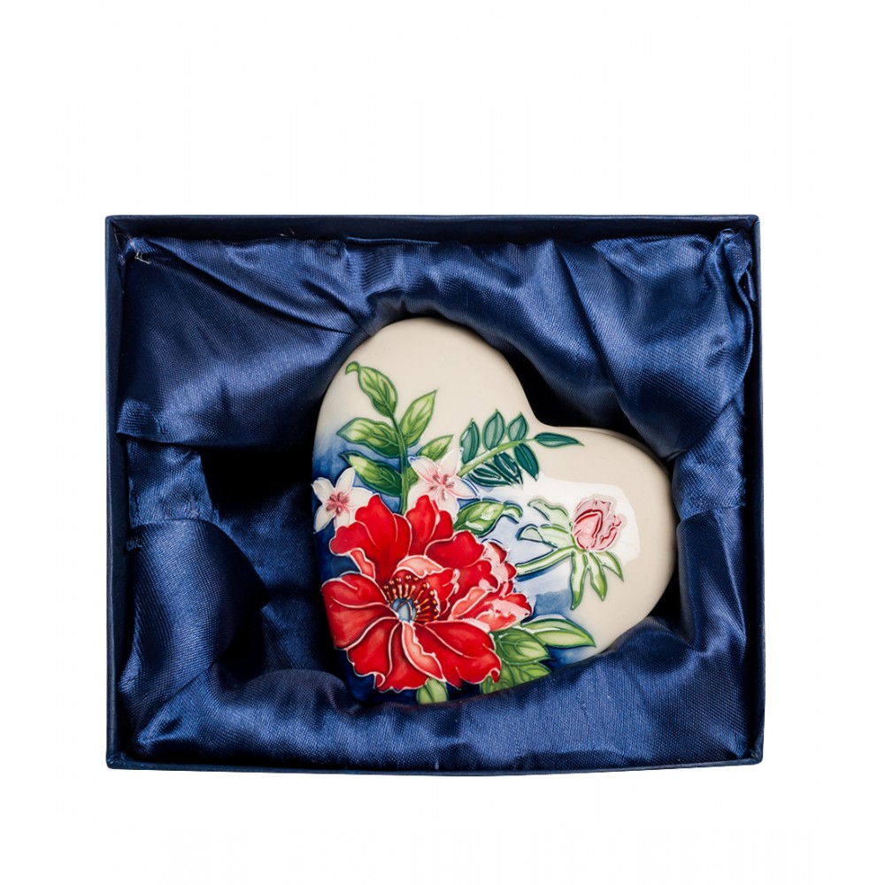 Стильная и оригинальная шкатулка в форме сердечка. Предмет изготовлен из белого фарфора и украшен изображениями прекрасных цветов и листьев. Поверхность покрыта блестящей глазурью. Такая шкатулка прекрасно подойдёт для хранения мелких памятных предметов, а также драгоценностей и украшений. Аксессуар поставляется в коробке с мягкой обивкой, и обивка, и коробка имеют тёмно-синий цвет.