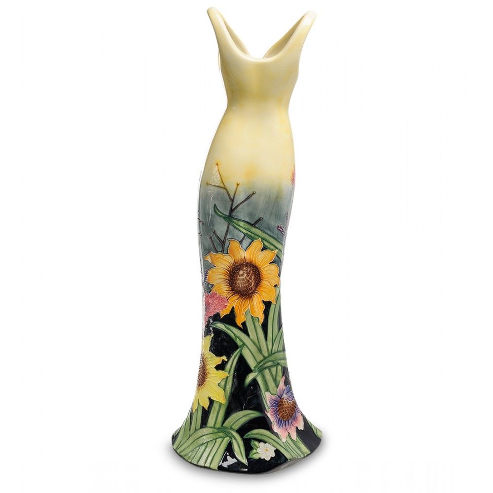Напольная ваза « Платье » настолько изыскана, что никто с этим не будет спорить. Она словно шедевр искусства. Мастера проработали каждую ее деталь. Декольте, подол платья, плавные линии талии смотрятся просто роскошно. А чего только стоит цветовая гамма. Ее нежный, теплый верх превосходно дополняется удивительной картиной цветов. Цветы настолько яркие, что невозможно их не заметить. Они дополняют и делают просто идеальной и совершенной вазу-платье.