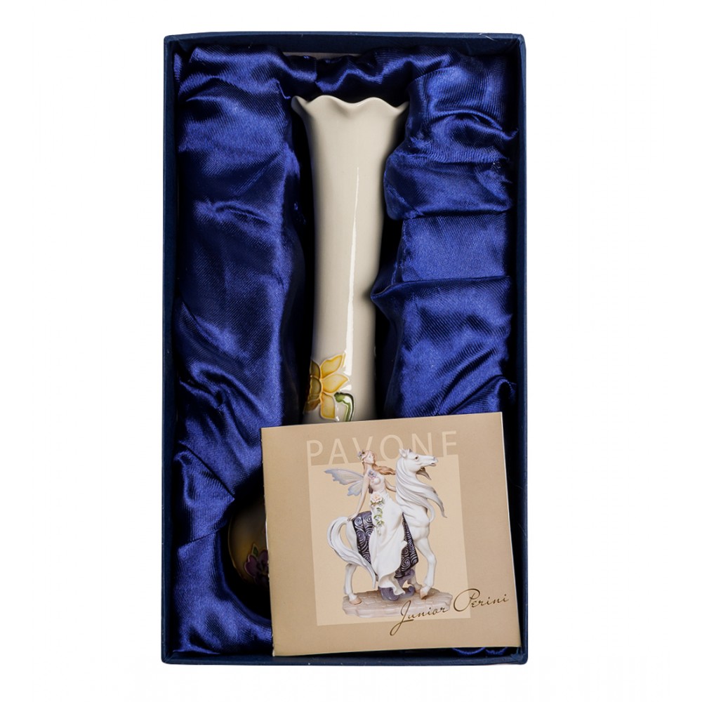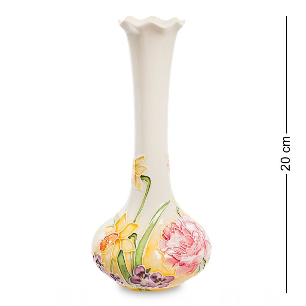 Фарфоровая ваза имеет изящную удлиненную форму, расширяясь книзу, образует устойчивое основание, которое не позволит вазе перевернуться. Расписанная весенними цветами, ваза сама по себе представляет предмет искусства. В ней прекрасно расставлены акценты: сначала внимание привлекает огромный розовый пион, затем взгляд приковывает пара нарциссов и, уже в самом конце, обращаешь внимание на маленькую фиалку справа.
