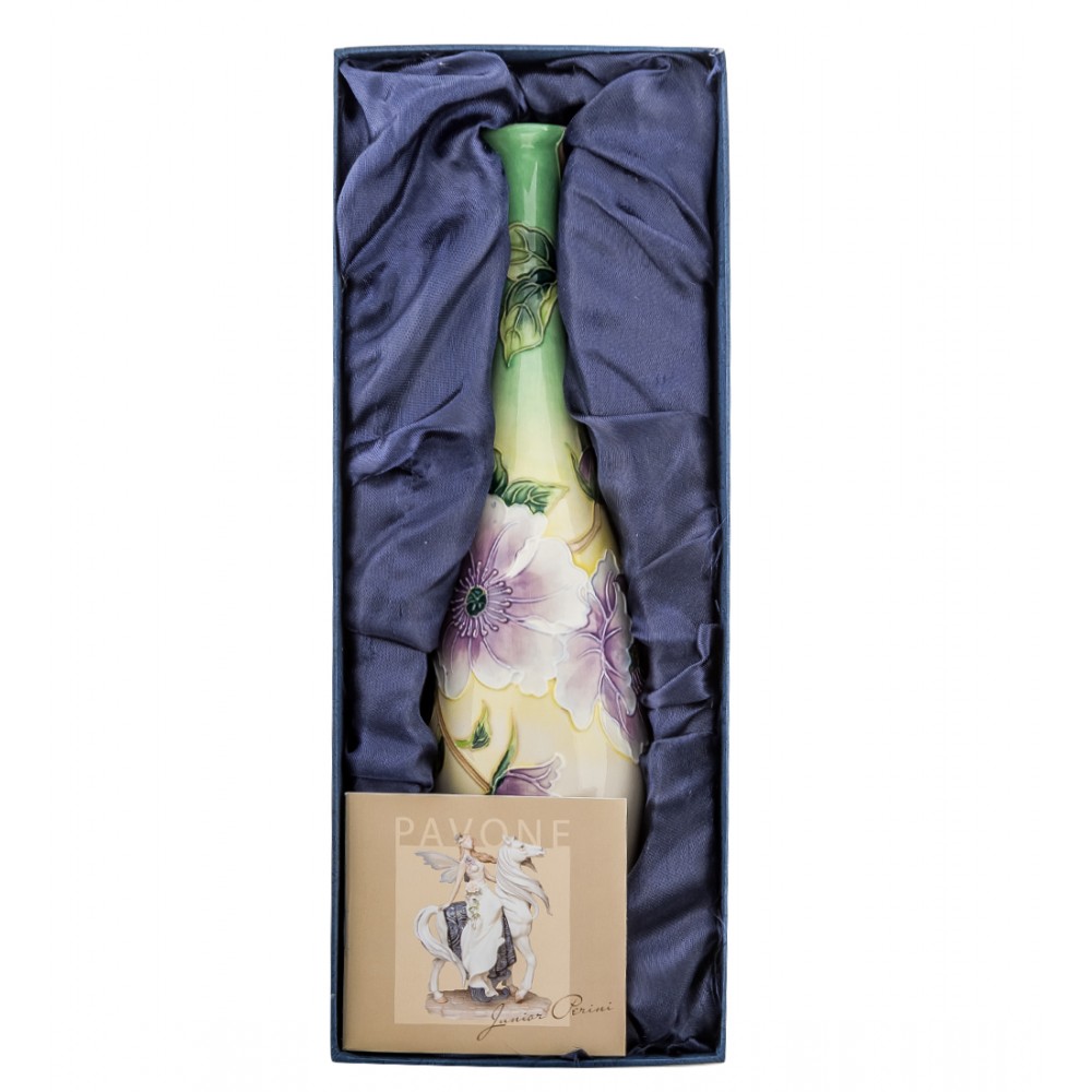 Высокая, украшенная бабочками или цветами на нежном светлом фоне, она растопит сердце каждой женщины, тем более, если в связке с вазой сразу же презентовать и цветы. Изысканная форма, настоящий итальянский фарфор и талант специалистов компании "Павоне" - вот что делает эту вазу фактически прекрасным подарком для женщин человечества.