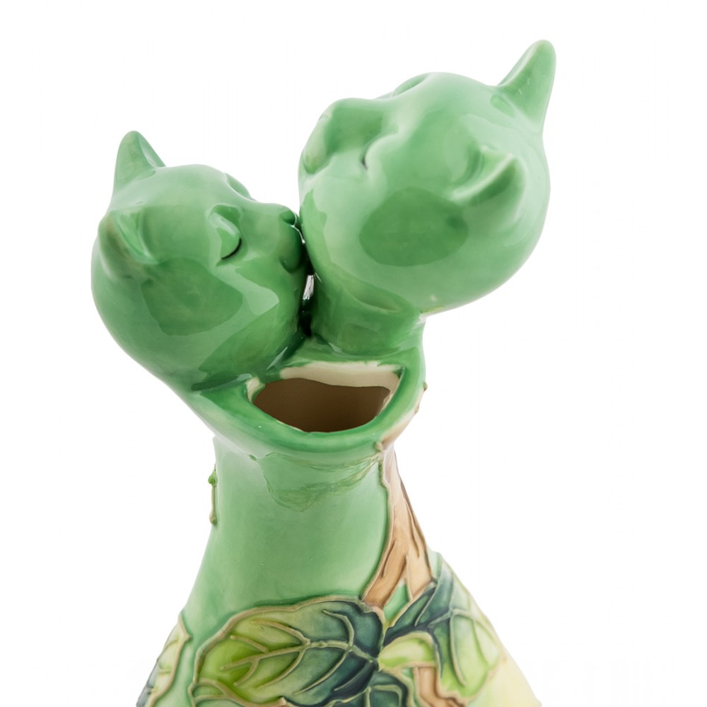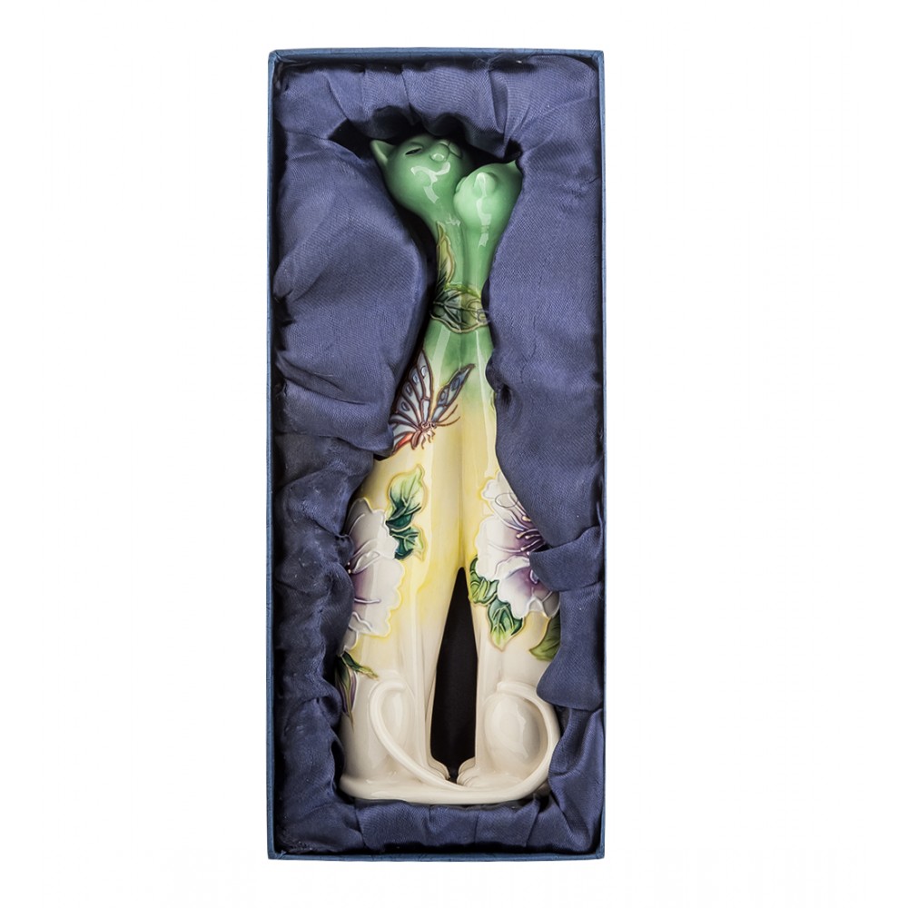 Эта ваза из фарфора — прекрасный подарок молодожёнам, влюбленным парам и на свадебную годовщину. Она в себе совмещает любовь и ласку, приятное удовольствие от прикосновений. Кошечки восторгаются друг другом, мило прислонившись носиками. Ваза для цветов красиво украшена орнаментом из цветов, имеет маленькое горлышко, поэтому подходит для одиночных цветков в виде голландской розы, и также будет служить в качестве интерьерного украшения.