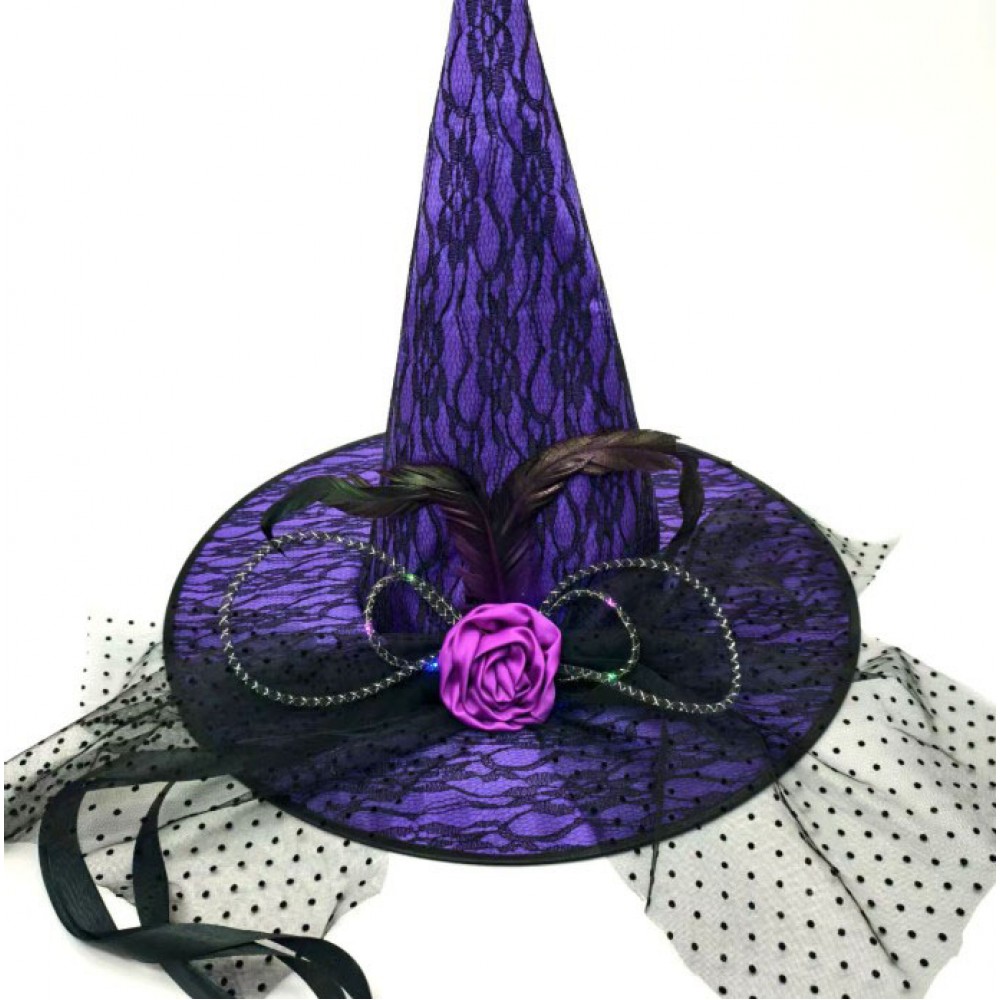 Капелюх відьми фіолетовий з мереживом і трояндою