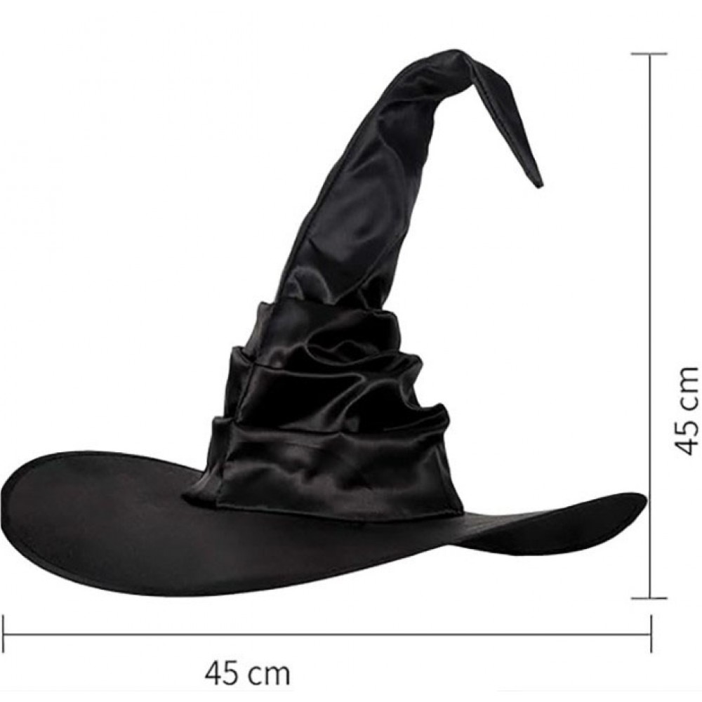 Розкішна шапка відьми з елегантними збірками створена для тих, хто цінує стиль і якість. Атласний матеріал створює благородний блиск, а драматичні збірки на конусі додають головному убору характер та індивідуальність. Широкі поля забезпечують класичний силует, а високий конус робить образ величним і загадковим.