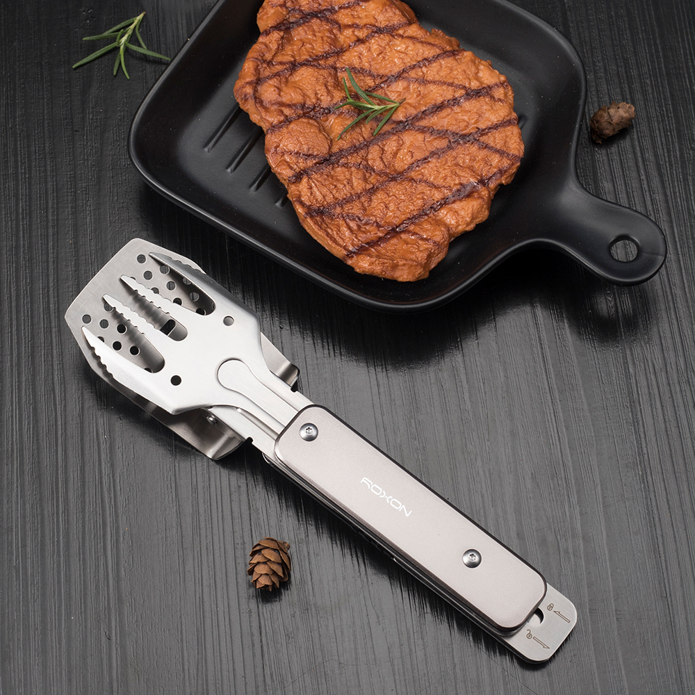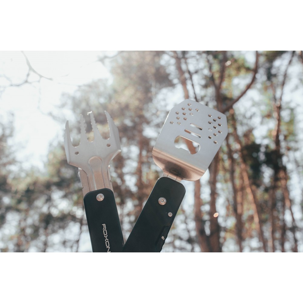 Модель Multi BBQ Tool MBT MINI S602 від бренду Roxon – це компактна версія мультиинструмента для приготування барбекю. Він складається з металевих лопатки і виделки, які можуть використовуватися як самостійні інструменти, а разом утворюють зручні щипці. Крім того, в інструмент вбудована проста відкривачка для пляшок.