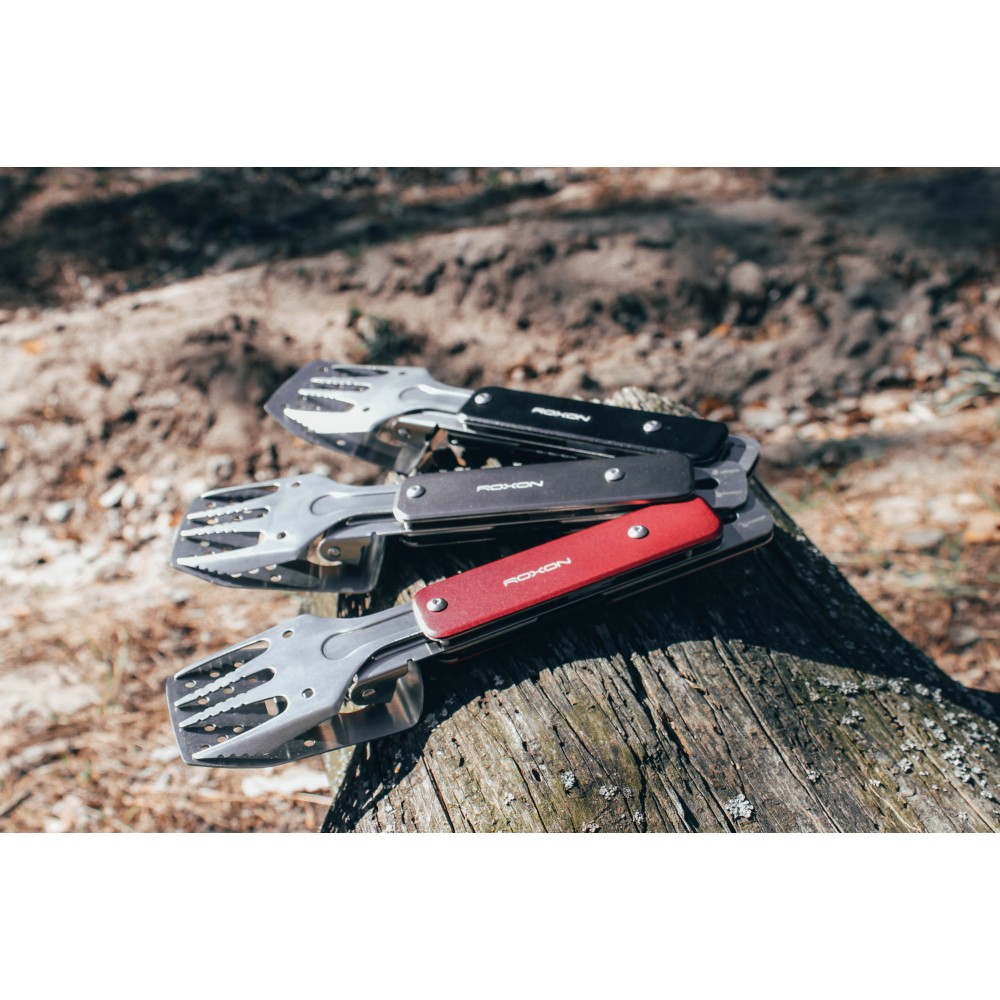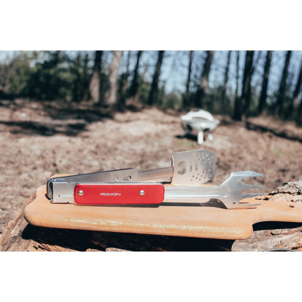 Модель Multi BBQ Tool MBT MINI S602 від бренду Roxon – це компактна версія мультиинструмента для приготування барбекю. Він складається з металевих лопатки і виделки, які можуть використовуватися як самостійні інструменти, а разом утворюють зручні щипці. Крім того, в інструмент вбудована проста відкривачка для пляшок.