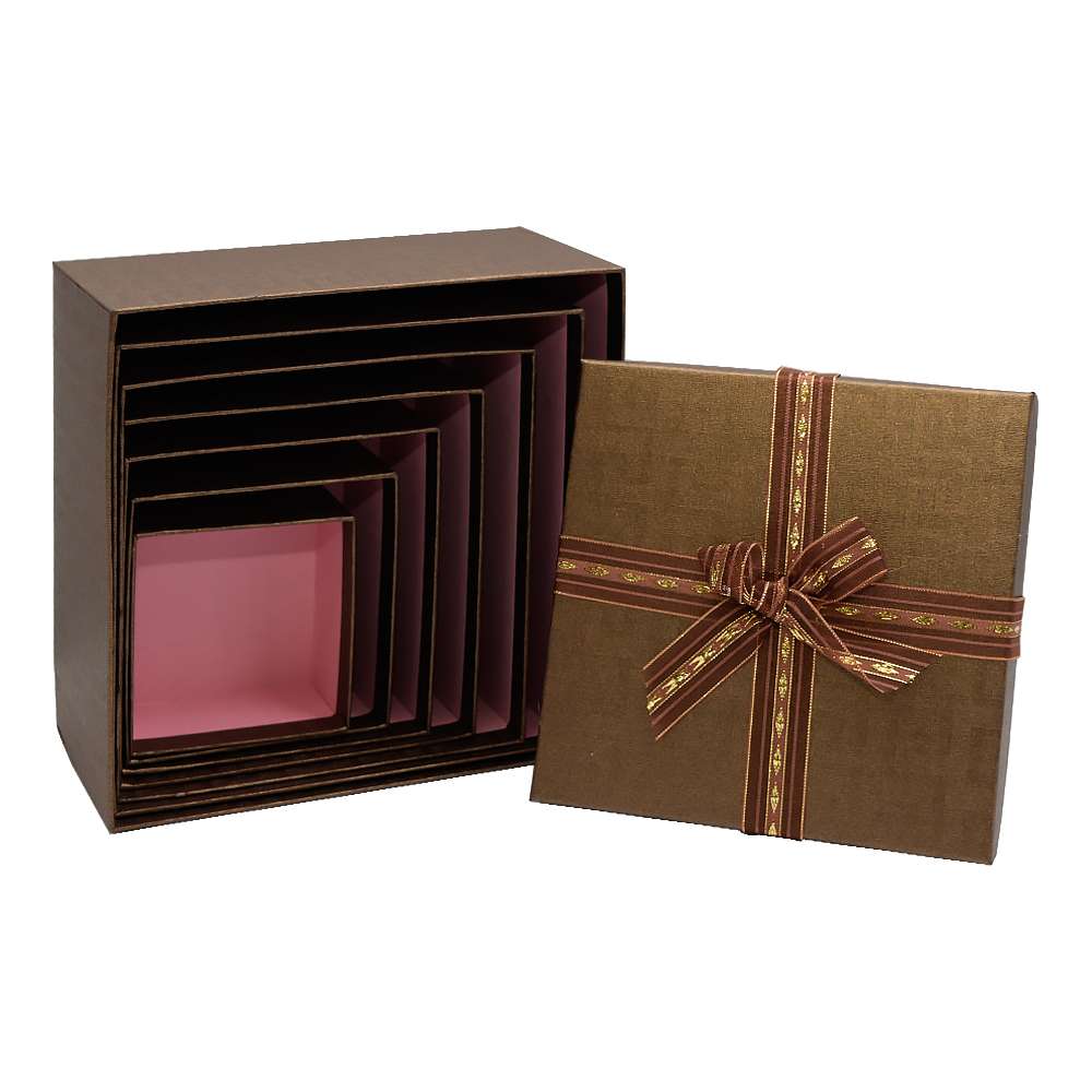 Ми хочемо допомогти вам максимально доповнити свій асортимент упаковки незвичайних подарунків, тому пропонуємо вам купити подарункову коробку КП-1.2 (набір 7шт), в набір входить 7 коробок різних розмірів. Інтернет магазин Карнавал Жартів пропонує набір подарункових коробок різного розміру, який стане незамінним атрибутом у святкові дні і збільшить середній чек замовлення. Адже для будь-якого подарунку потрібна упаковка. Хіба не чудово, коли все можна купити в одному місці? Подарункова коробка формату кришка-дно, з зовнішнього боку оформлена в сучасному стилі, коричневого кольору, прикрашена коричнево-золотою стрічкою з бантом на кришці, внутрішньою в білий колір. Матеріал виготовлення – багатошаровий крейдований картон щільністю 235 гр/м2. Подарункові коробки - підходять не лише для пакування подарунка. Але й свого роду є подарунком. Куди надалі можна буде складати різні дрібнички. Так само підходять для створення живих кольорів композицій. Стильні та ніжні коробочки ідеально підійдуть для дизайну інтер'єру, а також для зберігання ваших речей-дрібниць. Буде ідеальним доповненням до оригінального подарунка дівчині, мамі, дружині.
