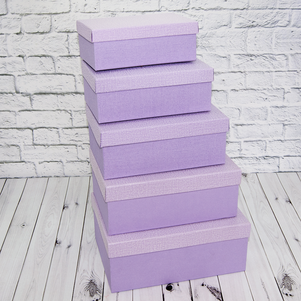 МатеріалкартонКраїна-виробник товаруКитайРозмір27х20х11см, 25х18х10 см, 23х23х9 см, 21х14х8 см, 19х12х7 см.КолірсиреневыйУсі характеристики