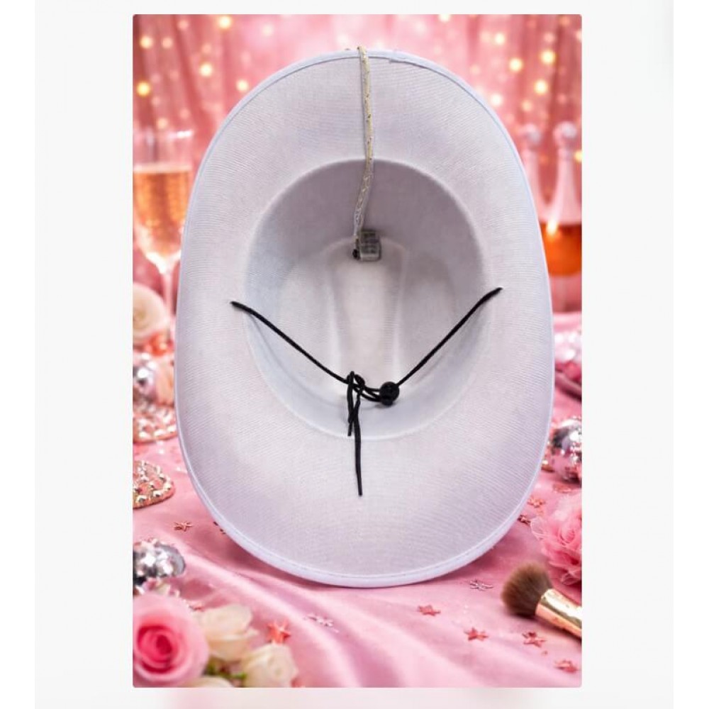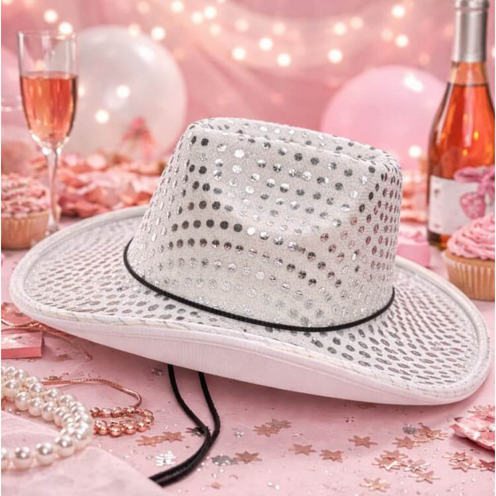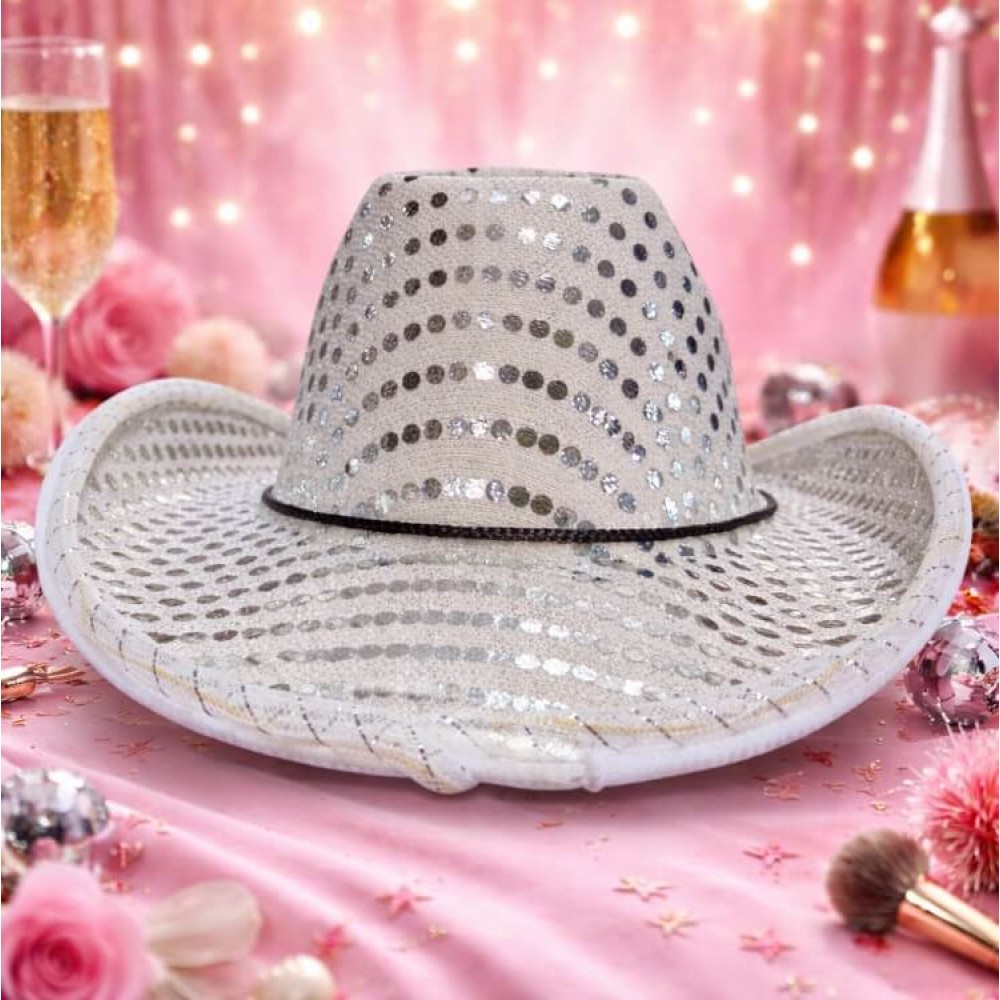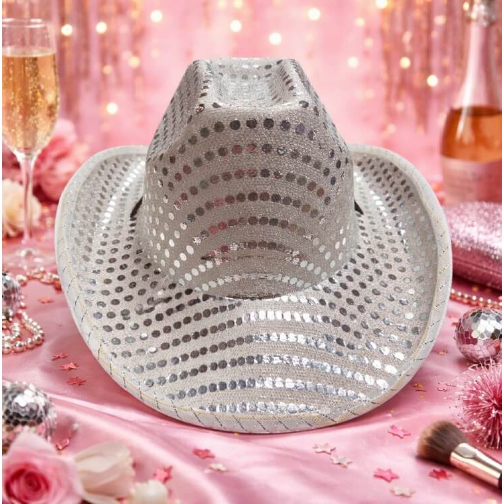 Сріблястий ковбойський капелюх із підсвічуванням особливо гарно виглядає у вечірньому освітленні, під софітами, неоном та клубним світлом. На фото та відео вона теж виглядає чудово: блиск паєток і світиться контур по краю роблять кадр живішим, дорожчим і помітнішим. Це вдалий вибір для TikTok, Instagram, святкових роликів, концертних образів та яскравих зйомок.