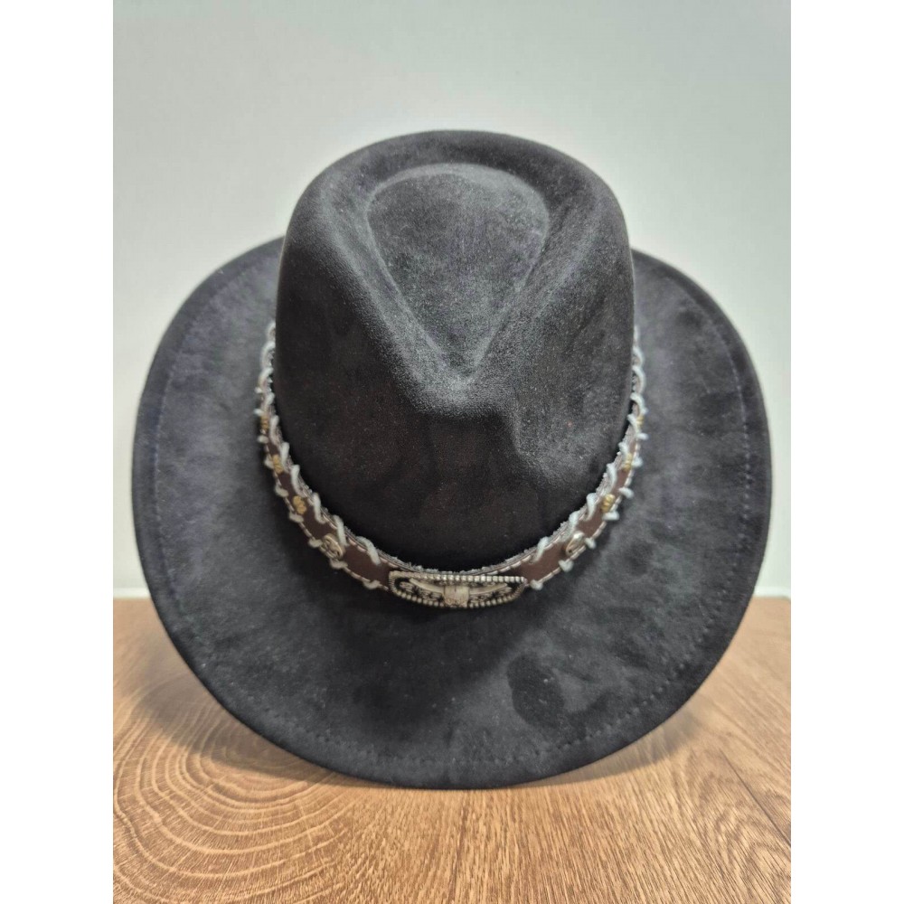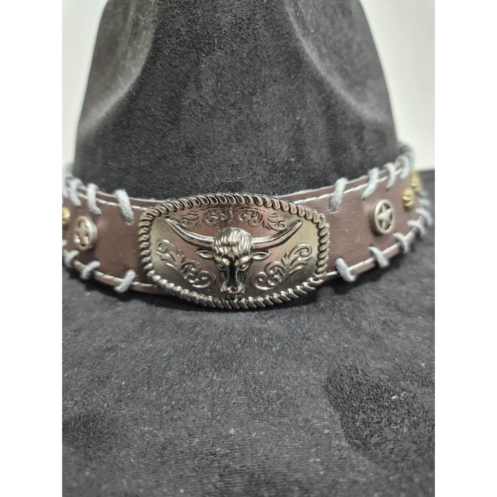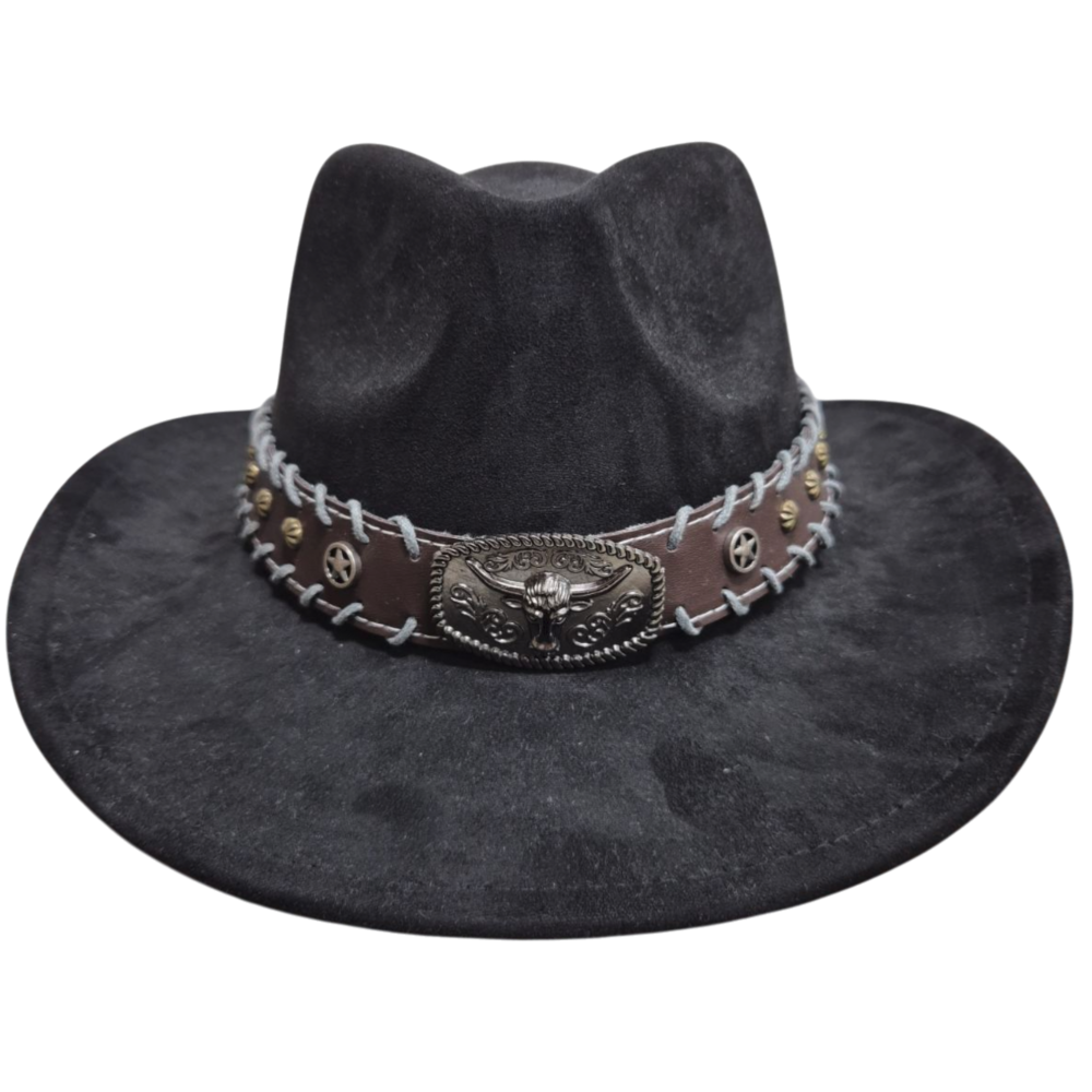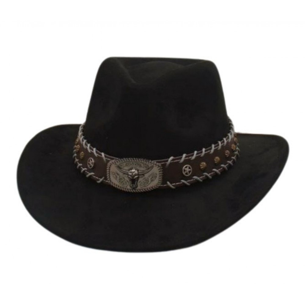 Чорний ковбойський капелюх з великою пряжкою «голова бика» — стиль Дикого Заходу