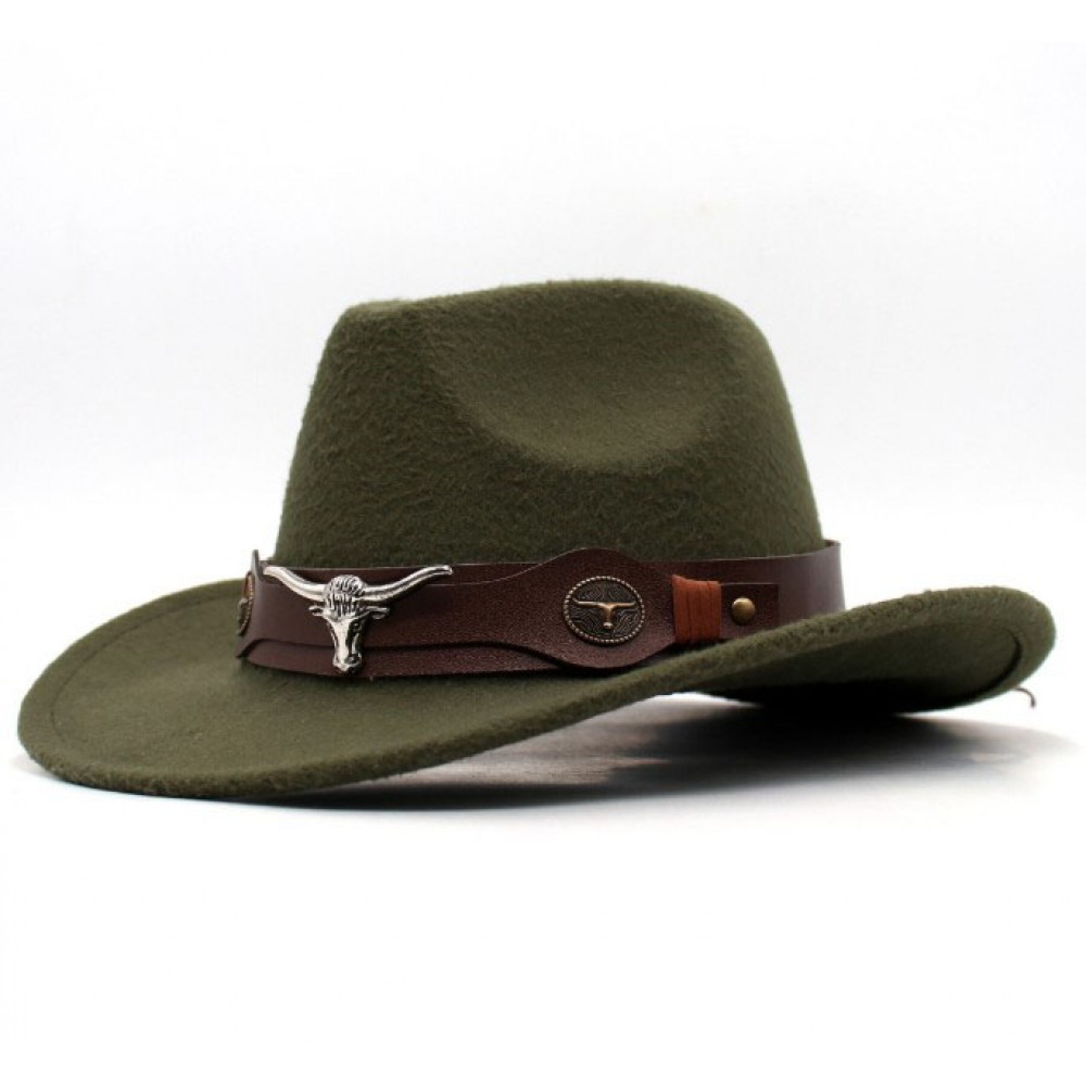 Ковбойський капелюх дорослий M (56–58 см) армійський зелений з коричневим ременем і биком