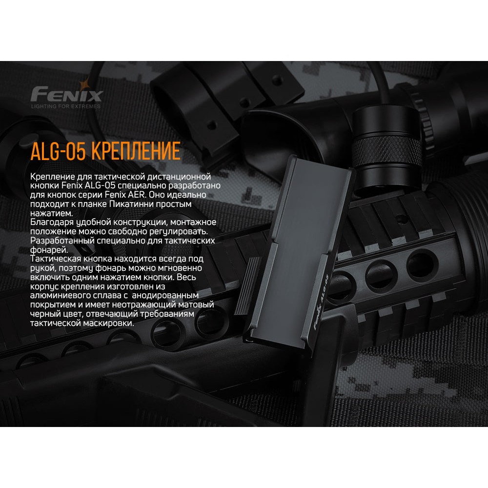 Кріплення Fenix ALG-05 призначений для фіксації тактичних виносних кнопок серії Fenix AER. Кнопка разом з кріпленням дозволяє управляти тактичним ліхтарем дистанційно. Підходить для тактичних ліхтарів торгової марки Fenix.