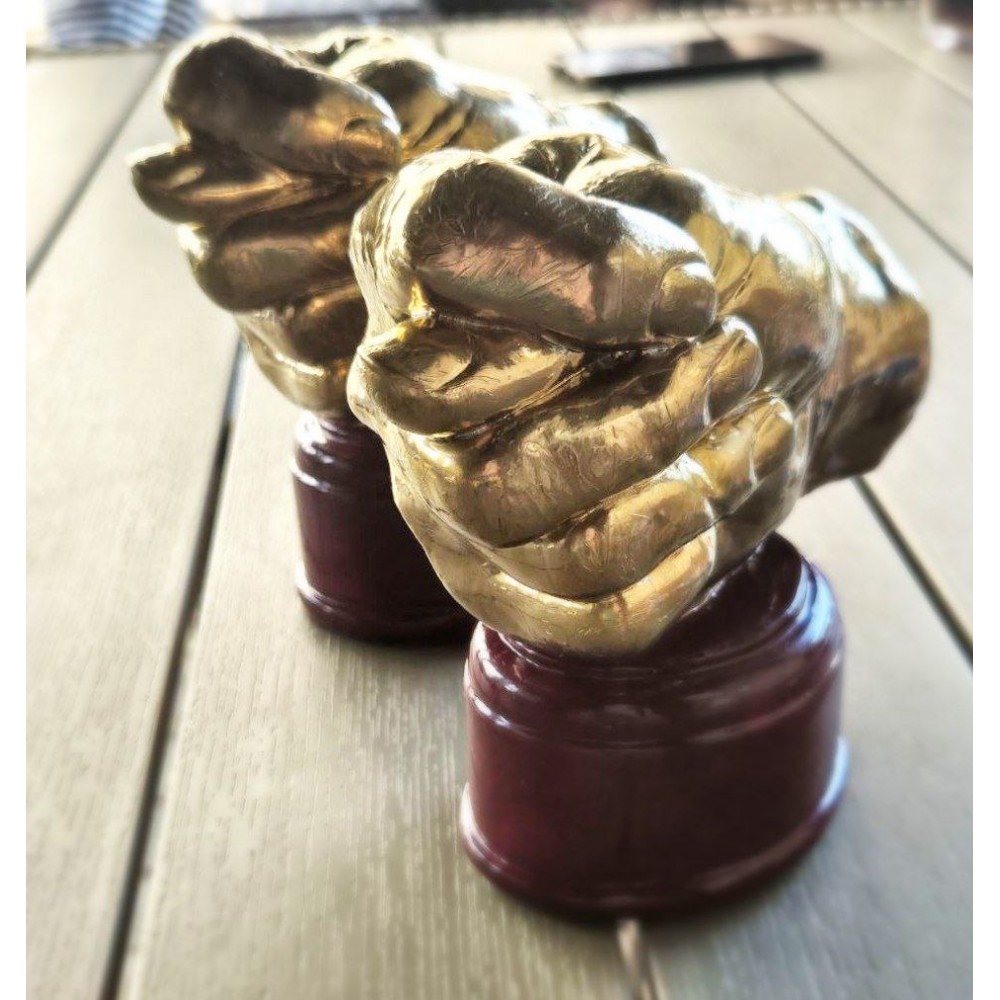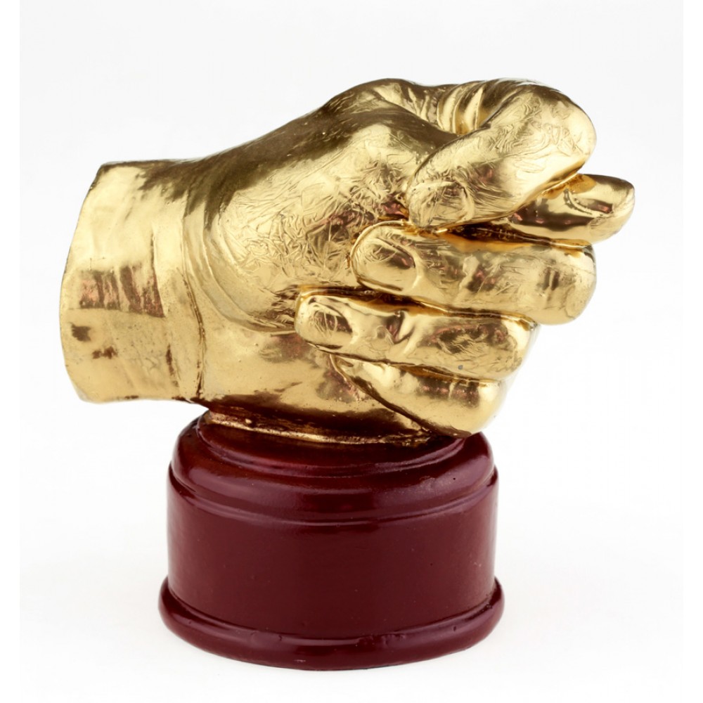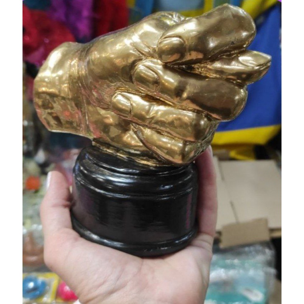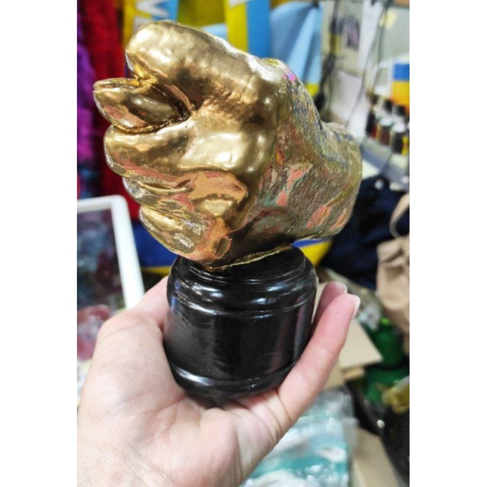 Кубок Золотий рука фіга (дуля) Оригінальний кубок у вигляді жесту руки "дуля" який також відомий як "фіга" або "дулю" виконаний у натуральну величину. Виглядає незвичайно та яскраво, буде незвичайним подарунком. А також стильна фішка інтер'єру модель кубка виконана з реальної руки. Кубок повторює структуру шкіри руки, що надає йому деякої брутальності. Звертаємо вашу увагу, що це не є дефектом цього товару