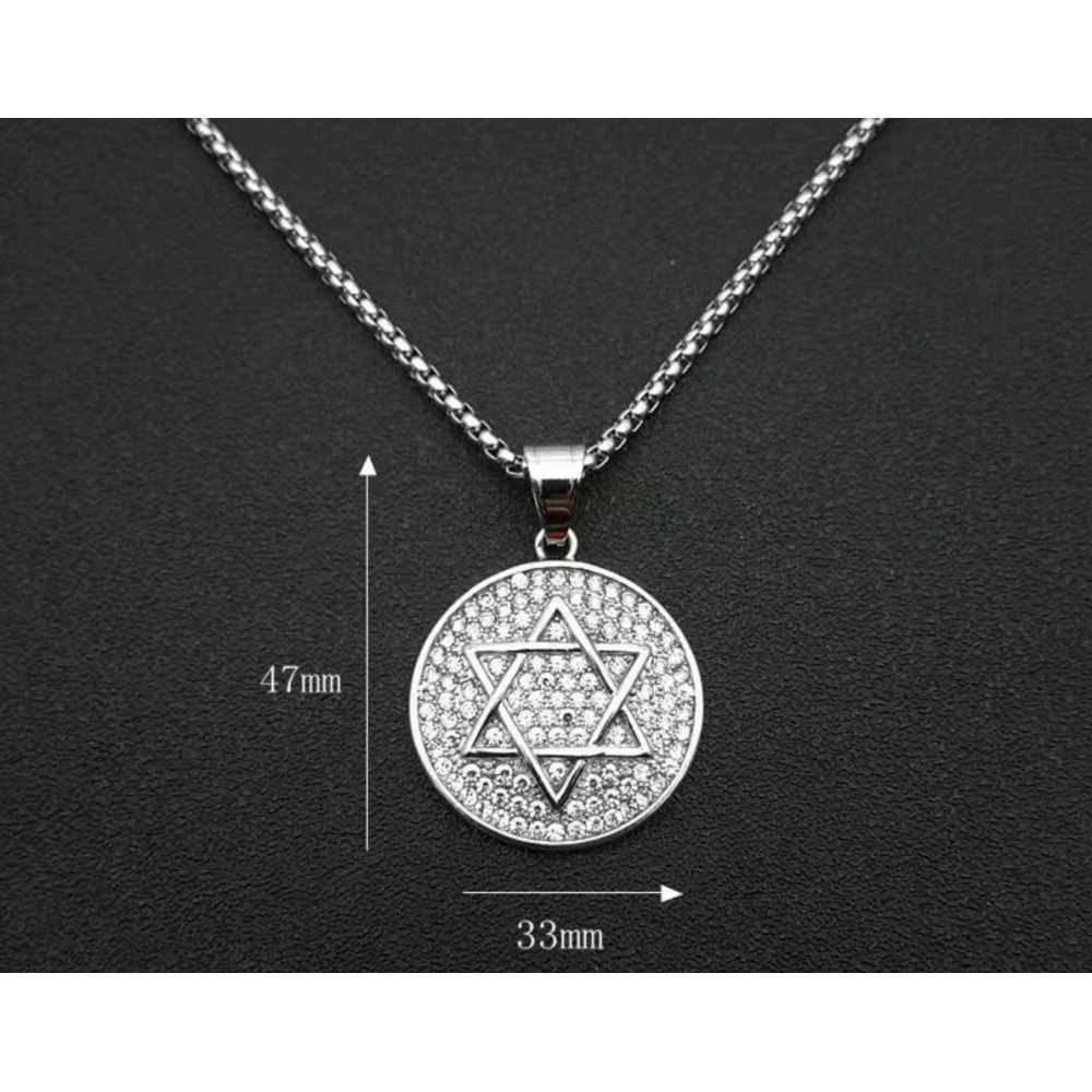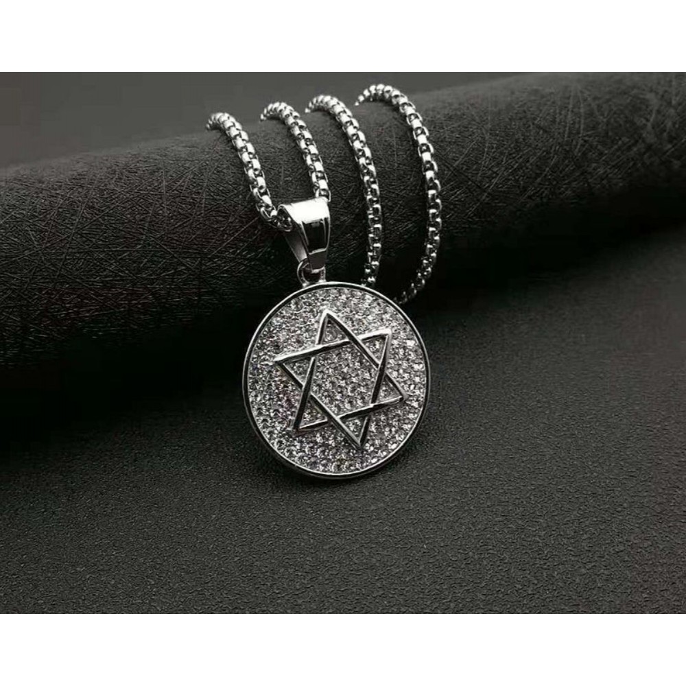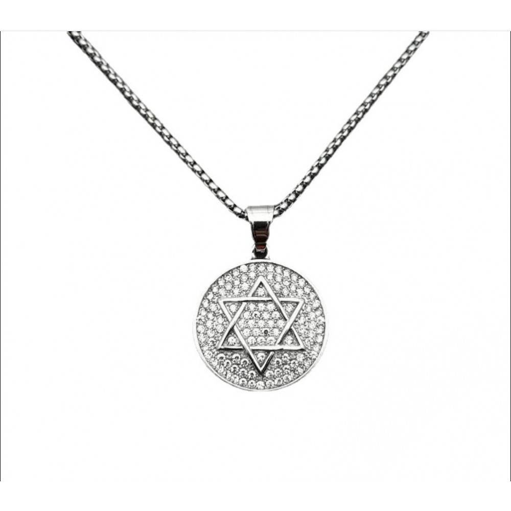 Цей кулон виглядає трохи інакше, ніж класичні варіанти — тут Зірка Давида ніби втоплена в колі, повністю засипаному дрібними каменями. Завдяки цьому з'являється ефект «дорогого блиску», ніби прикраса грає на світлі при кожному русі.