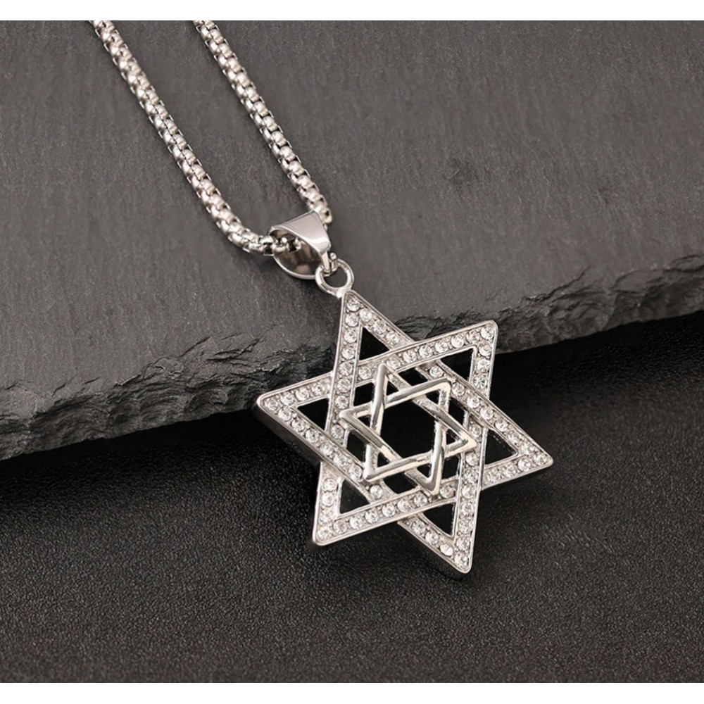 Ефектний кулон у формі подвійної зірки Давида, прикрашений сяючими каменями, які надають прикрасі глибини та виразності. Він гармонійно поєднує в собі строгість форми та легке мерехтіння, створюючи благородний акцент в образі. Ланцюжок у комплекті завершує композицію, роблячи прикрасу готовою до носіння з перших хвилин.