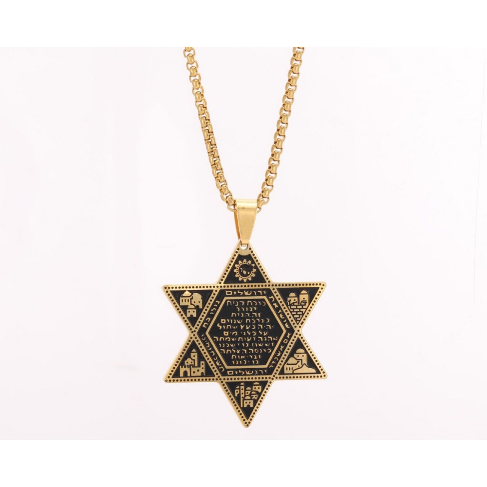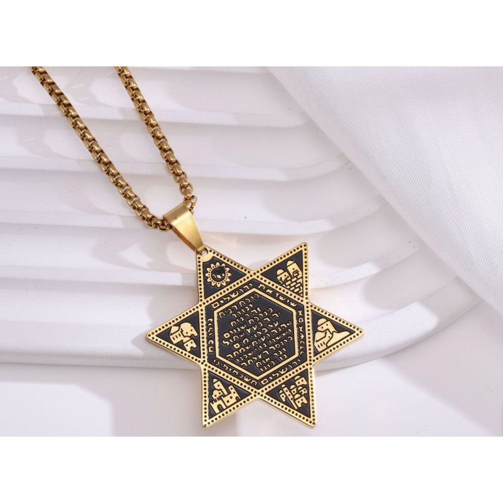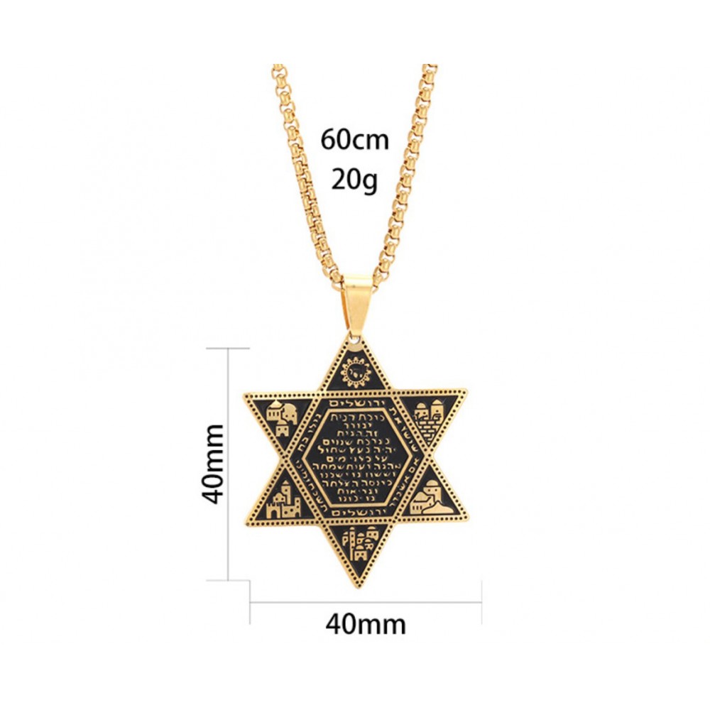 Більш насичений варіант кулона зі Зіркою Давида — з гравіюванням і додатковими елементами по краях. Виглядає не як простий аксесуар, а вже як акцентна річ. Підійде під повсякденний стиль або як подарунок, коли хочеться щось помітне і «з вагою».