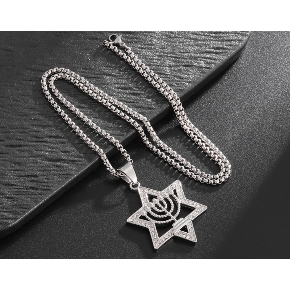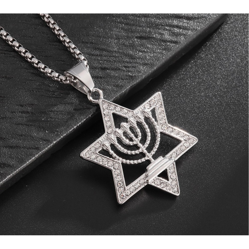 Виразний кулон із символом менори, укладеним у зірку Давида і доповненим сяючими вставками. Прикраса поєднує в собі глибокий зміст і стриману благородність форми. Комплектується ланцюжком, завдяки чому образ виглядає завершеним і гармонійним.