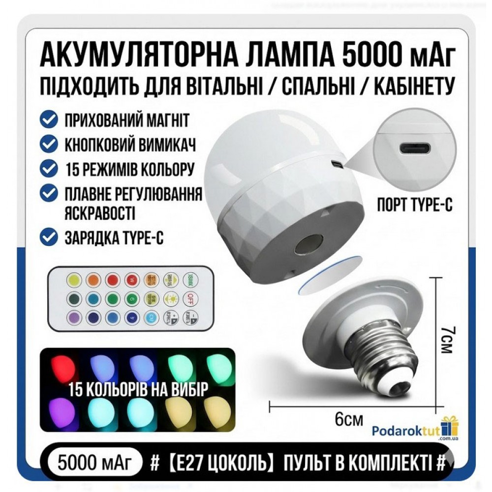 Лампочка з акумулятором 5000 mAh E27 Type-C: Розумна RGB лампа з пультом