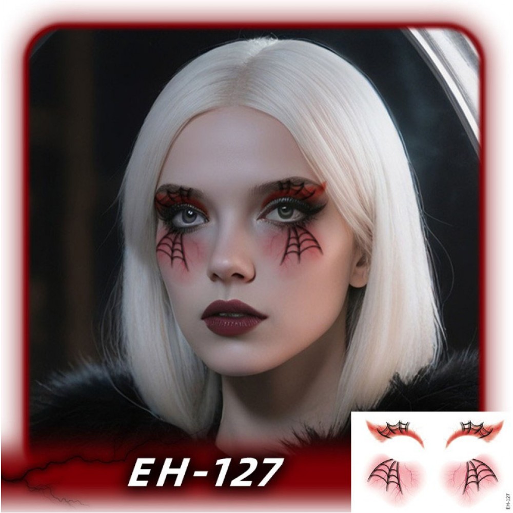 Графічне тату на Хелловін з набору EH-127 — це ефект «павутинки» у зовнішніх куточках очей і м'які червоні тіні-розтушовки. За півхвилини ви отримуєте виразний погляд без складного гриму і латексу. Плівка тонка і еластична, тому тату на Хелловін повторює міміку, не тріскається і виглядає натурально в кадрі та при сценічному освітленні.