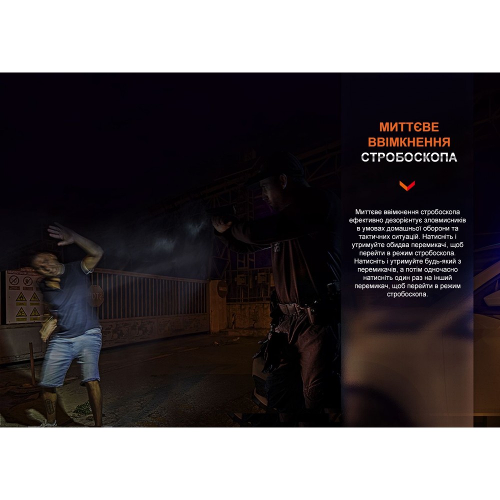 - Стробоскоп активується затисканням одного перемикача та одночасним коротким кліком другого перемикача.