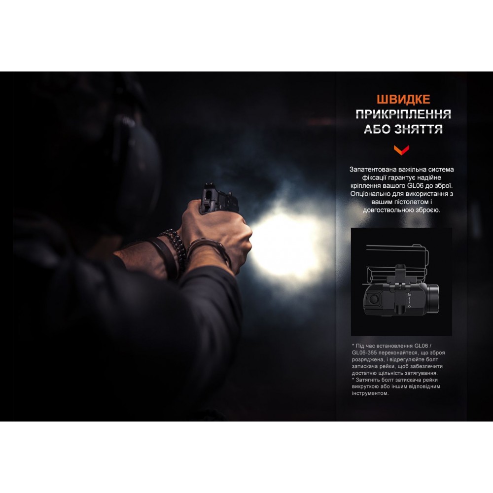 Ліхтар Fenix GL06 — це спеціалізований освітлювальний пристрій для представників поліції та охоронців, які застосовують у своїй діяльності зброю. Конструкція ліхтаря передбачає фіксацію на пістолет із планкою Пікатінні або Glock. Кріплення здійснюється одним рухом руки: для цього потрібно пересунути бічну панель до упору вниз у напрямку символу із закритим замком. Для кожної планки до комплекту входять окремі ключі.