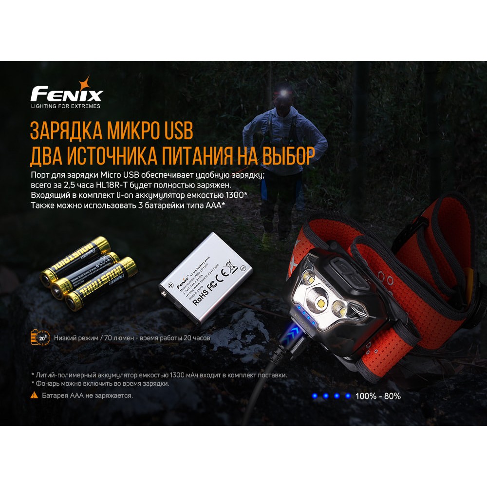 Модель Fenix HL18R-T є легким налобним ліхтарем, призначеним для трейлраннінга. Налобник з симпатичним дизайном володіє двома джерелами живлення, які управляються за допомогою двох незалежних перемикачів. Можна використовувати літій-полімерний акумулятор ARB-LP1300. Також в ролі джерела живлення можуть виступати 3 батарейки типу AAA. Джерела живлення налобника гарантують надійність під час довгих пробіжок по погано освітлених дорогах. Застосовуючи цей налобний ліхтар, ви завжди будете мати хороше якісне освітлення, коли в тому є необхідність.