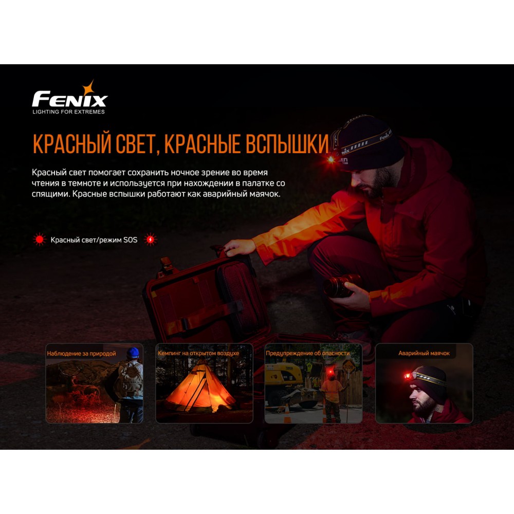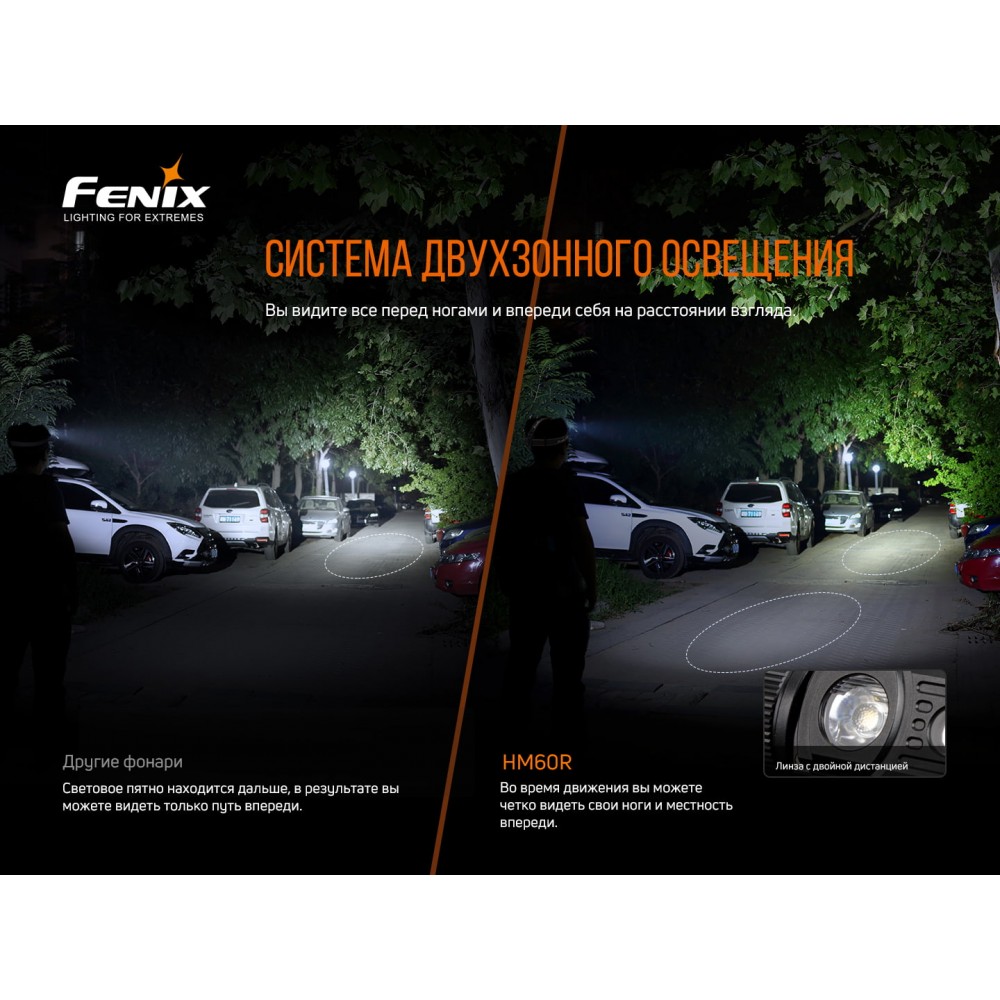 Дальнє світло, ближнє світло і червоне світло комбінуються. Виробник Fenix турбується про те, щоб виготовляти якомога більш просунуті моделі, тому постійно покращує їх і випускає вдосконалені ліхтарі. Новою рисою в цьому ліхтарі є сенсор частоти кроку: яскравість змінюється разом зі швидкістю руху. Налобник Fenix HM60R створений для максимальної зручності його власників.