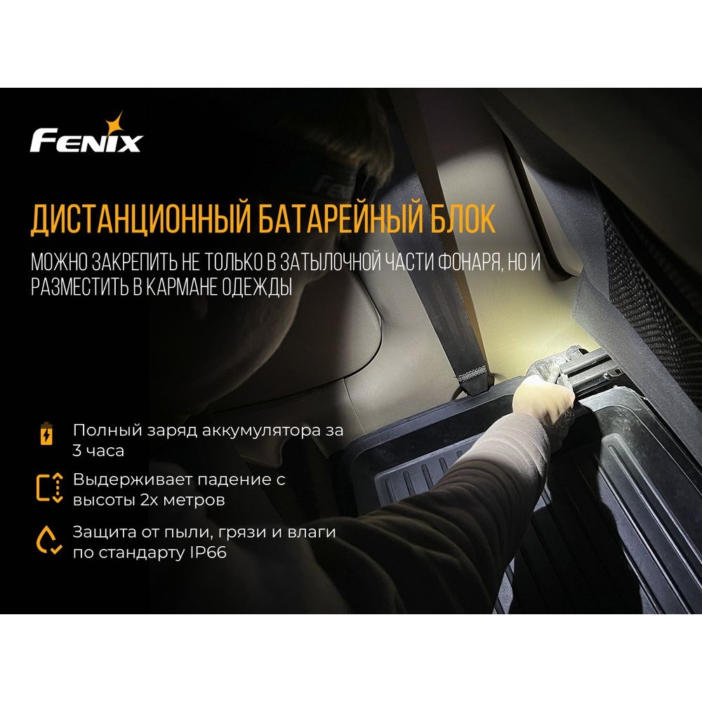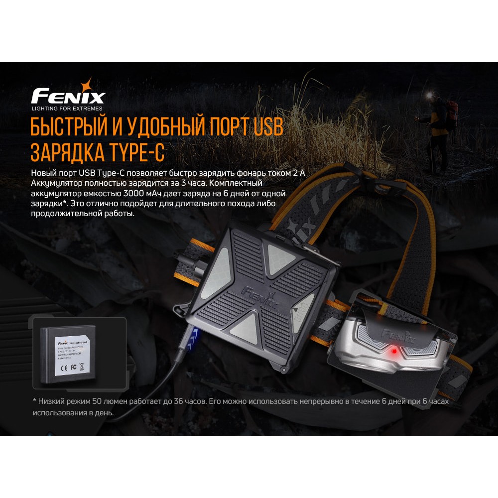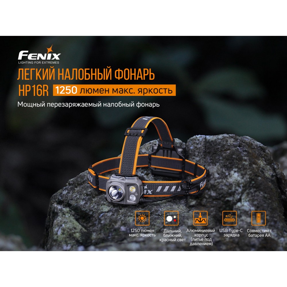 Налобний ліхтар Fenix HP16R є перезаряджається високопродуктивною моделлю. Він забезпечує світловий потік в 1700 люменів, а відстань дії становить 260 метрів. Налобник здатний функціонувати протягом 300 годин в мінімальному режимі. Він має окремий батарейний відсік, живиться від літій-полімерного акумулятора Fenix ARB-LP3000. Також елементами живлення можуть бути чотири батареї Ni-MH /лужні типу AA. Зарядка батарей заборонена. Акумулятор заряджається через порт USB Type-C в батарейному відсіку. Щоб повністю зарядити дану модель, знадобиться 3 години часу.
