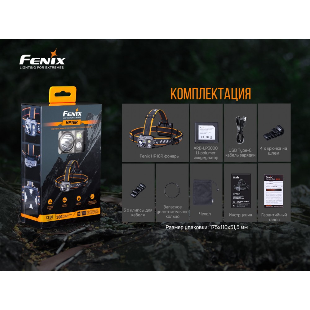 Налобний ліхтар Fenix HP16R, акумулятор ARB-LP3000 Li-polymer, кабель для зарядки USB Type-C, чотири гачки для кріплення на шолом, три кліпси для кабелю, запасне кільце ущільнювача, сумка для зберігання, керівництво користувача, талон гарантії.