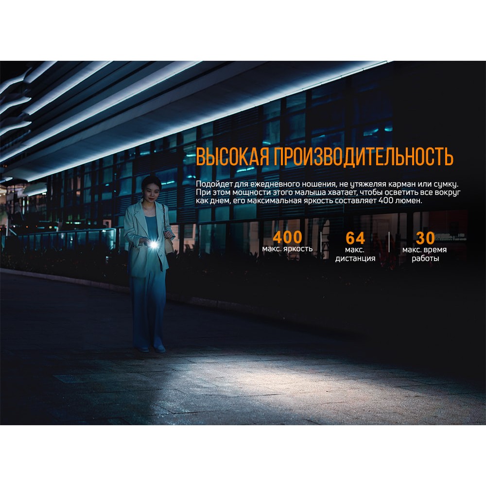 - Турбо. У цьому режимі ліхтар здатний видати максимальне значення яскравості, 400 люменів. Далекобійність променя досягає 64 метрів. Інтенсивність світлового потоку становить 1046 кандел.