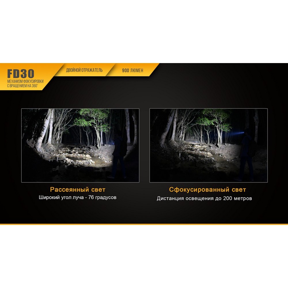 Модель фонаря Fenix FD30 рассчитана на использование в наиболее широком перечне ситуаций. Этот фонарь будет хорош для поездок на природу, походов, использовании на даче и в других случаях. Он оснащен диодом XP-L HI (Cree), который в режиме максимальной яркости предоставляет 900 люмен света. Универсальности этой модели способствует и то, что всего она поддерживает 6 режимов.- яркость Turbo: территория освещается на 67-200 м, уровень яркости — 900 люмен, период до разряда аккумулятора — 2 ч;