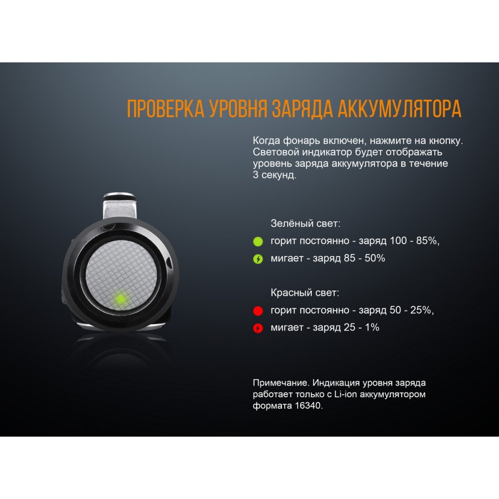 - Fenix LD15R здатний працювати від одного літій-іонного акумулятора типорозміру 16340 або від однієї літієвої батарейки формату CR123;