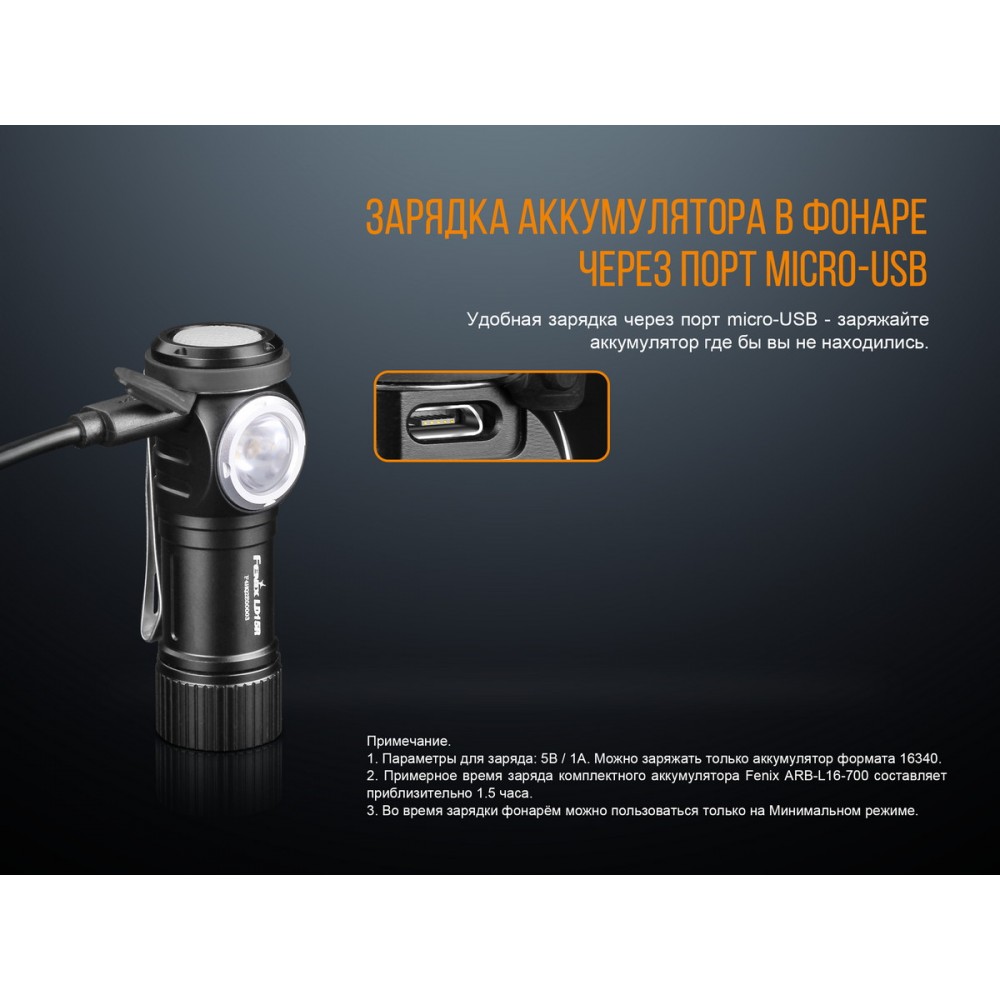 Комплектація | Ліхтар, акумулятор Fenix ARB-L16-700, USB кабель для зарядки, запасна гумова накладка, запасне кільце, чохол, інструкція, гарантія. | ||||||