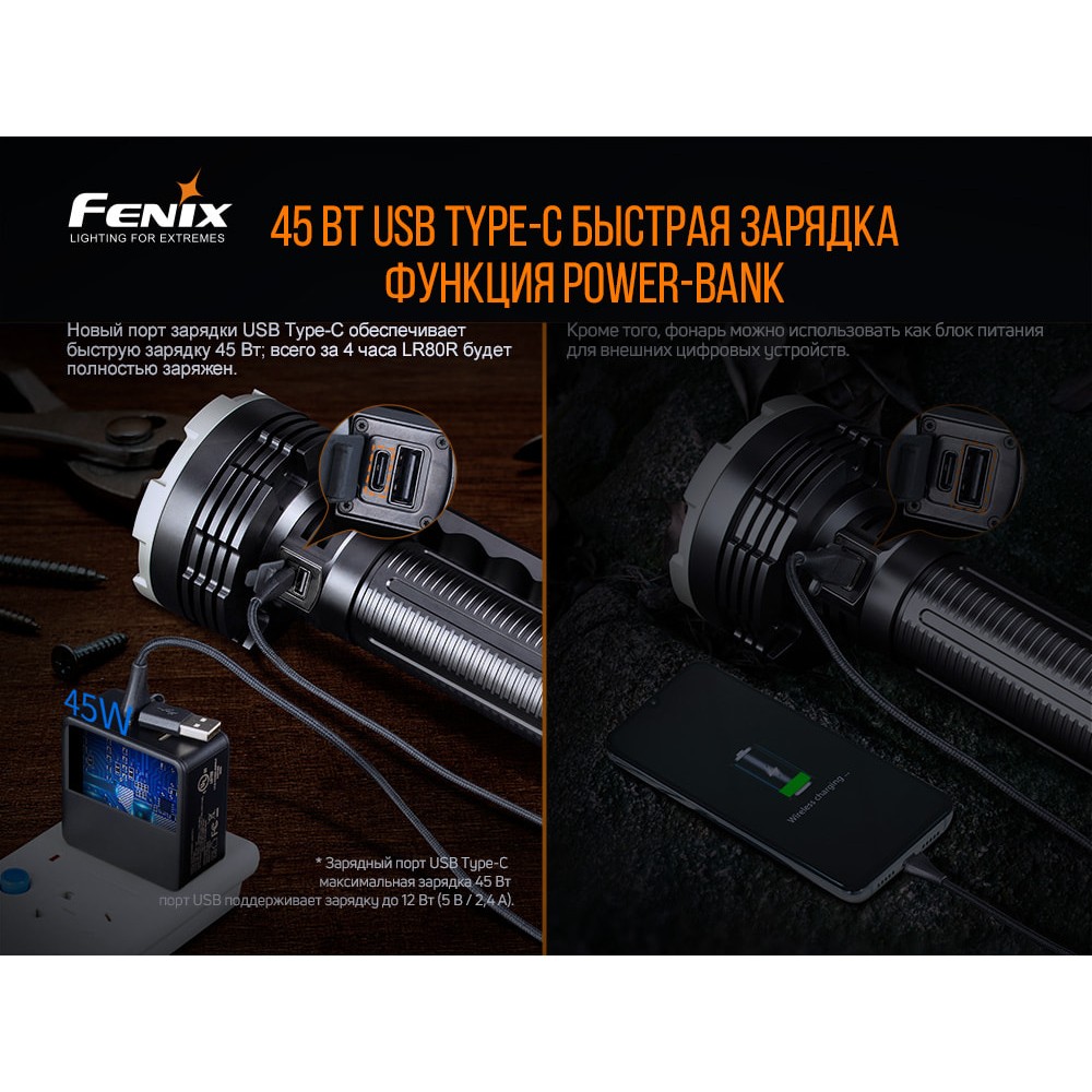 Ліхтар моделі Fenix LR80R являє собою дуже яскравий, компактний прилад для здійснення пошукових операцій. Його найбільший світловий потік досягає 18 тисяч люменів, при цьому далекобійність променя – понад кілометр. Прекрасні можливості для практичних завдань. Функціонує такий потужний ліхтар на батарейці 7,2 V/12000mah Li-ion, яка вбудована прямо в корпусі моделі. Акумулятор відрізняється досить великою продуктивністю, і без зарядки ліхтар здатний світити протягом 25 днів. Це допомагає виконати завдання, що вимагають великої ефективності.