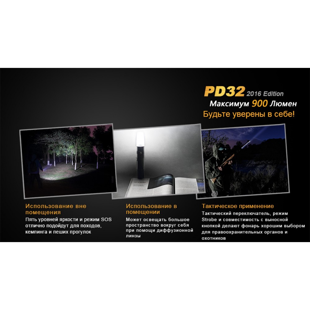 Модель PD32 2016 Edition отримала й інші якості, які дозволяють говорити про високу якість ліхтаря і зручність його експлуатації. Це захищеність від короткого замикання і від перегрівання, стабілізація яскравості на постійному рівні, можливість вносити в пам'ять ліхтаря останній активний рівень яскравості. Ця модель зручна ще й широкої сумісністю з фірмовими аксесуарами, такими як фільтри, тактичні кнопки, кріплення для велосипеда або ж мисливської зброї.