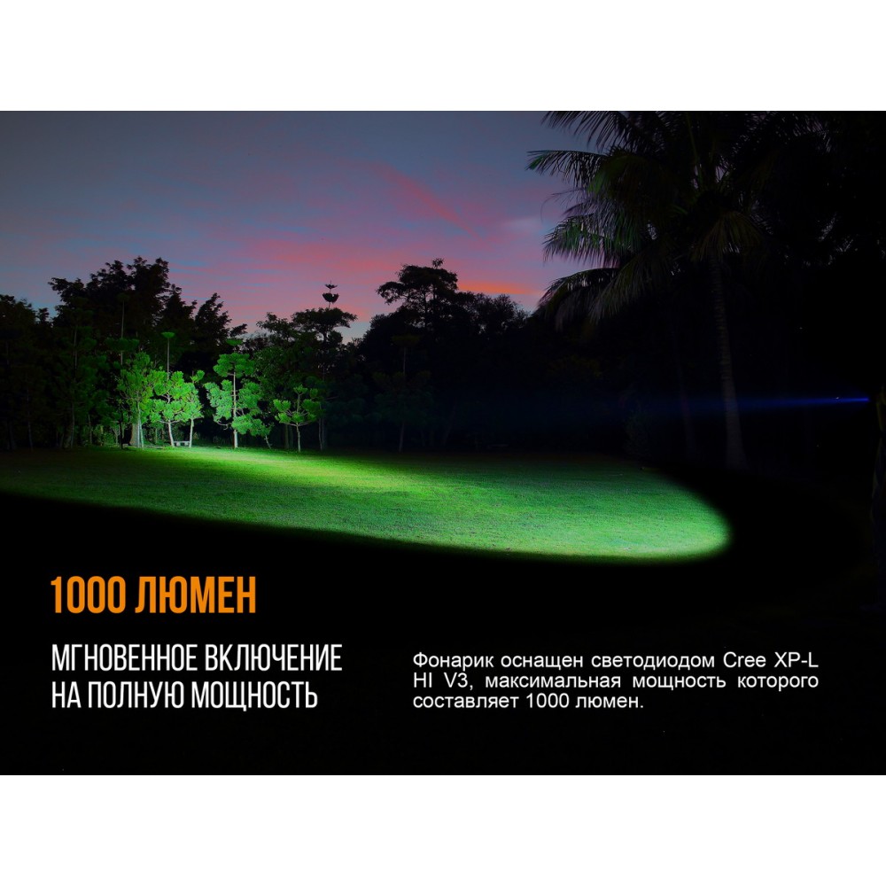 В ліхтарі Fenix PD35 V2.0 встановлений сучасний світлодіод американського виробництва Cree XP-L HI V3, який у свою чергу здатний створювати промінь світла з яскравістю до 1000 люмен і дальністю до 250 метрів.