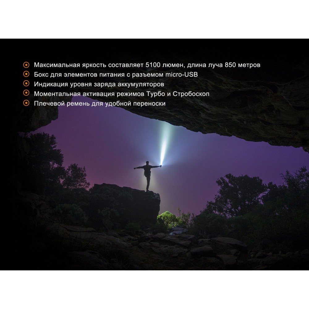 Комплектація | Ліхтар, кабель з роз'ємом micro-USB, ремінь на плече, ремінець на руку, 2 запасні гумові прокладки. | |||||||