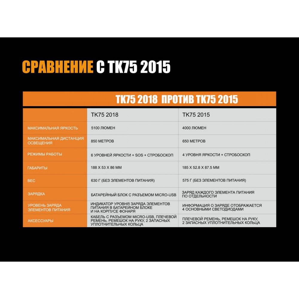 Ліхтар TK75 2018 став новою версією вже всім добре відомого TK75, який компанія Fenix випустила раніше. Крім того, що у нього збільшилася яскравість, ліхтар отримав і деякі інші якості, які роблять його бажаним придбанням для багатьох користувачів.