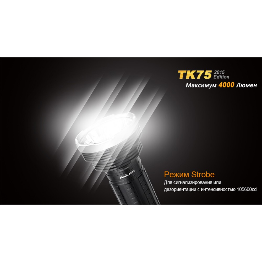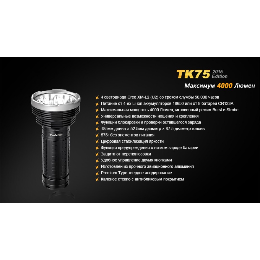 Модель Fenix TK75 (2015) використовує в якості джерела світла чотири світлодіода Cree XM-L2 (U2). Вони обрані за відмінні показники довговічності і яскравості. Спільно, чотири діода дають до 4000 люмен світла. А ресурс використання кожного з цих діодів становить не менше 50 000 ч. Ліхтар працює в шести режимах, з яких чотири відведені на рівні яскравості, а ще два забезпечують миттєвий доступ до постійного і блимати світла.