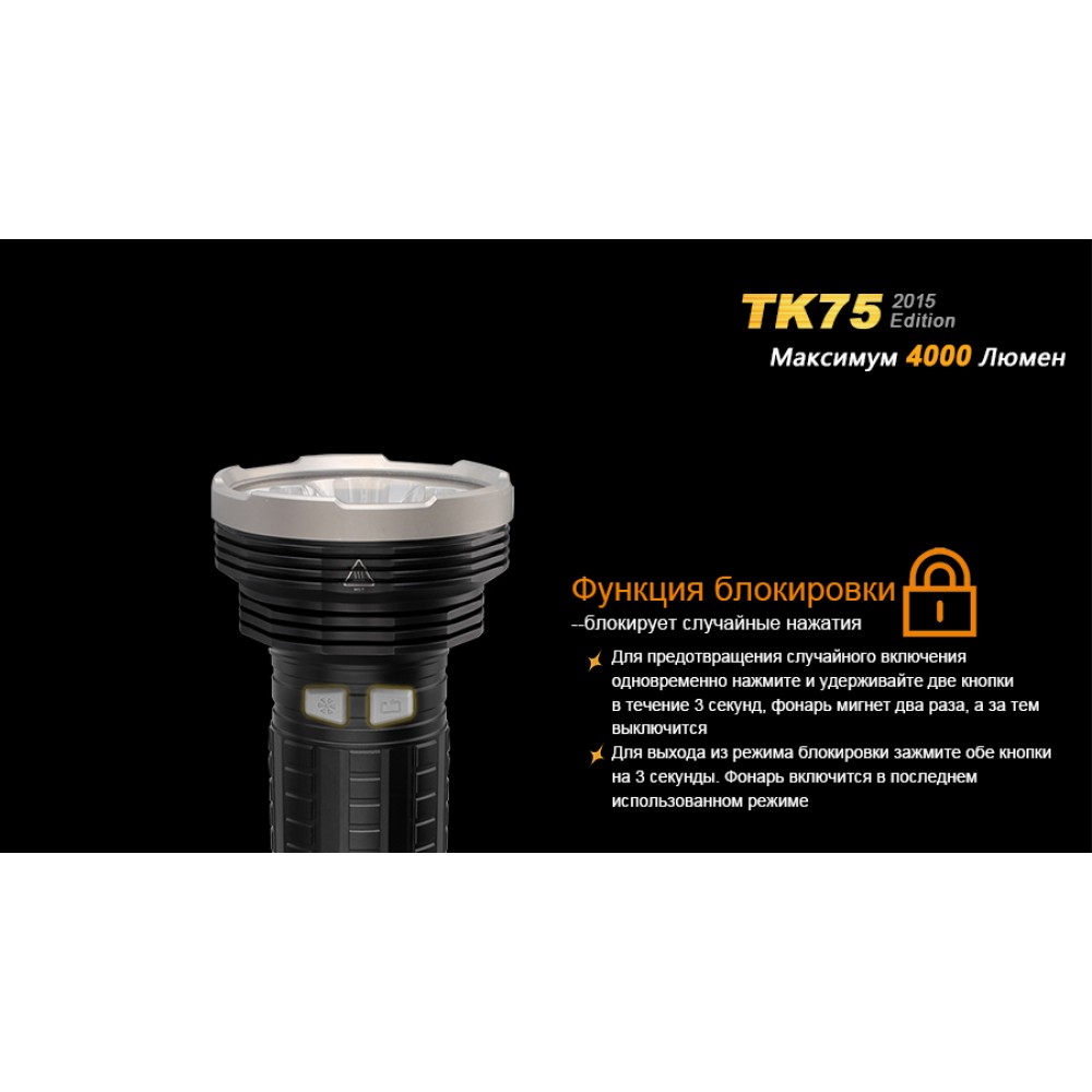 Уваги заслуговує функція блокування включення ліхтаря. Якщо натиснути одночасно обидві його кнопки і тримати з 3 с, ліхтар буде заблокований і не включиться випадково в рюкзаку або багажнику машини. Повторне таке ж натискання розблокує Fenix TK75 (2015).