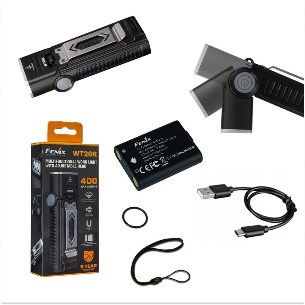 Fenix WT20R зручно використовувати за рахунок змінювати напрям променя під конкретні завдання. Але ця модель має й інші переваги. Ліхтар можна закріпити на ремені, у кишені, на лямці сумки за допомогою металевої кліпси. А в хвостову частину корпусу вбудований магніт для фіксації на залізних предметах. Сам корпус зроблений з алюмінію і володіє великим запасом міцності. Більш того, він захищений від намокання у відповідності з міжнародним стандартом IP-66.