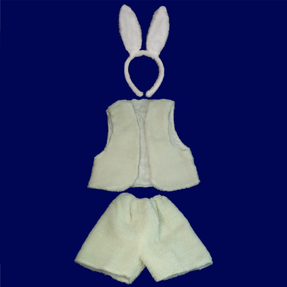 3-4 года, ширина плеч 25см, длина жилета 31см, длина шорт 26см, ширина шорт в растянутом виде 35см, длина ушек 30см в комплект входит - жилет, шорты, обруч с ушками