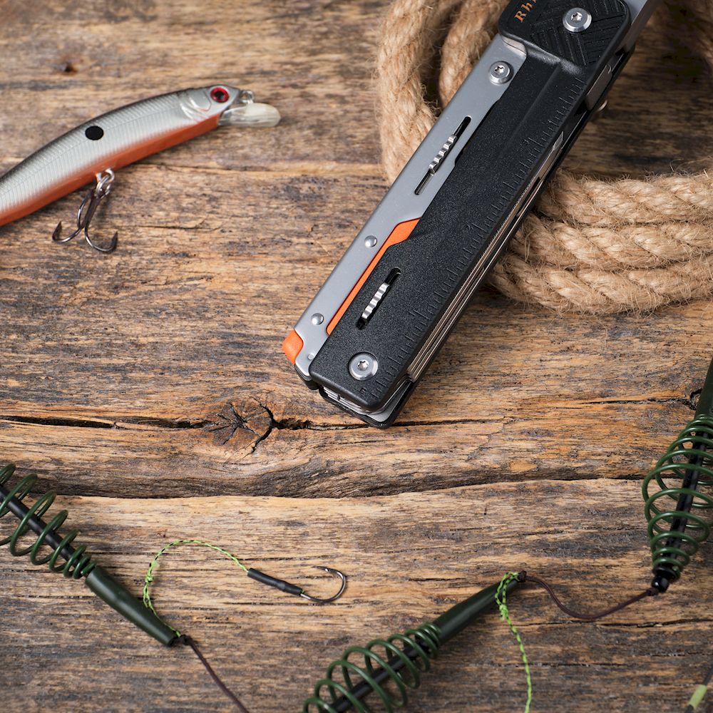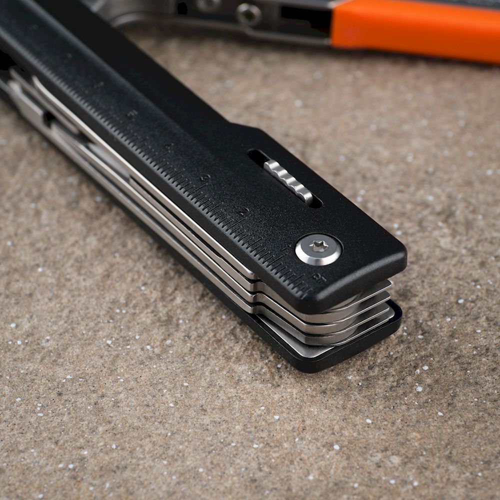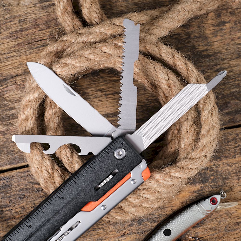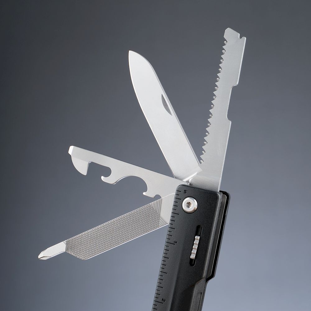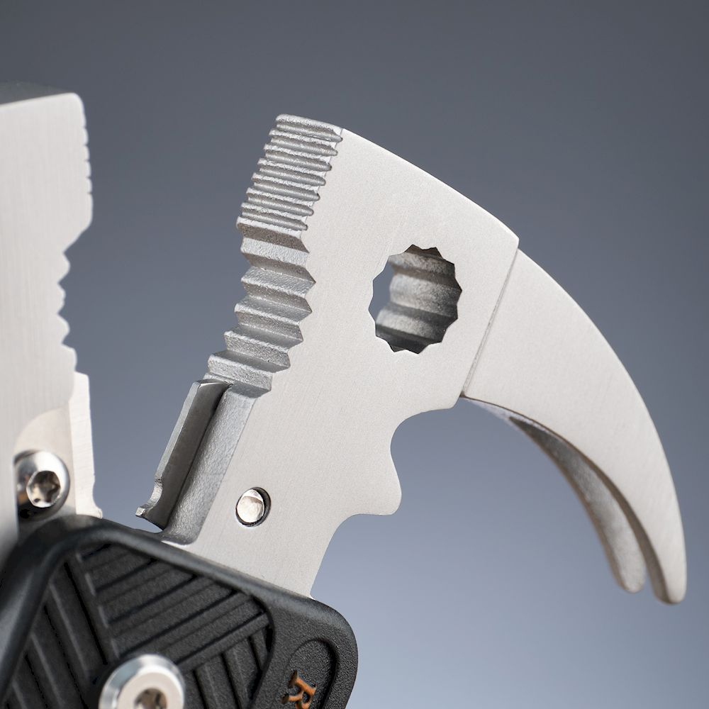 У хвіст рукояті інтегровано чотири допоміжні інструменти: клинок форми Drop Point з прямою ріжучою кромкою; міні пила з серейторним заточенням; один елемент із вбудованим стрипером; консервним ножем і плоскою викруткою; а також пилочка для нігтів із наконечником у вигляді викрутки Phillips. Кожен із елементів можна дістати з рукояті однією рукою і зафіксувати до клацання; щоб вони не закрилися під час використання та не поранили руку.